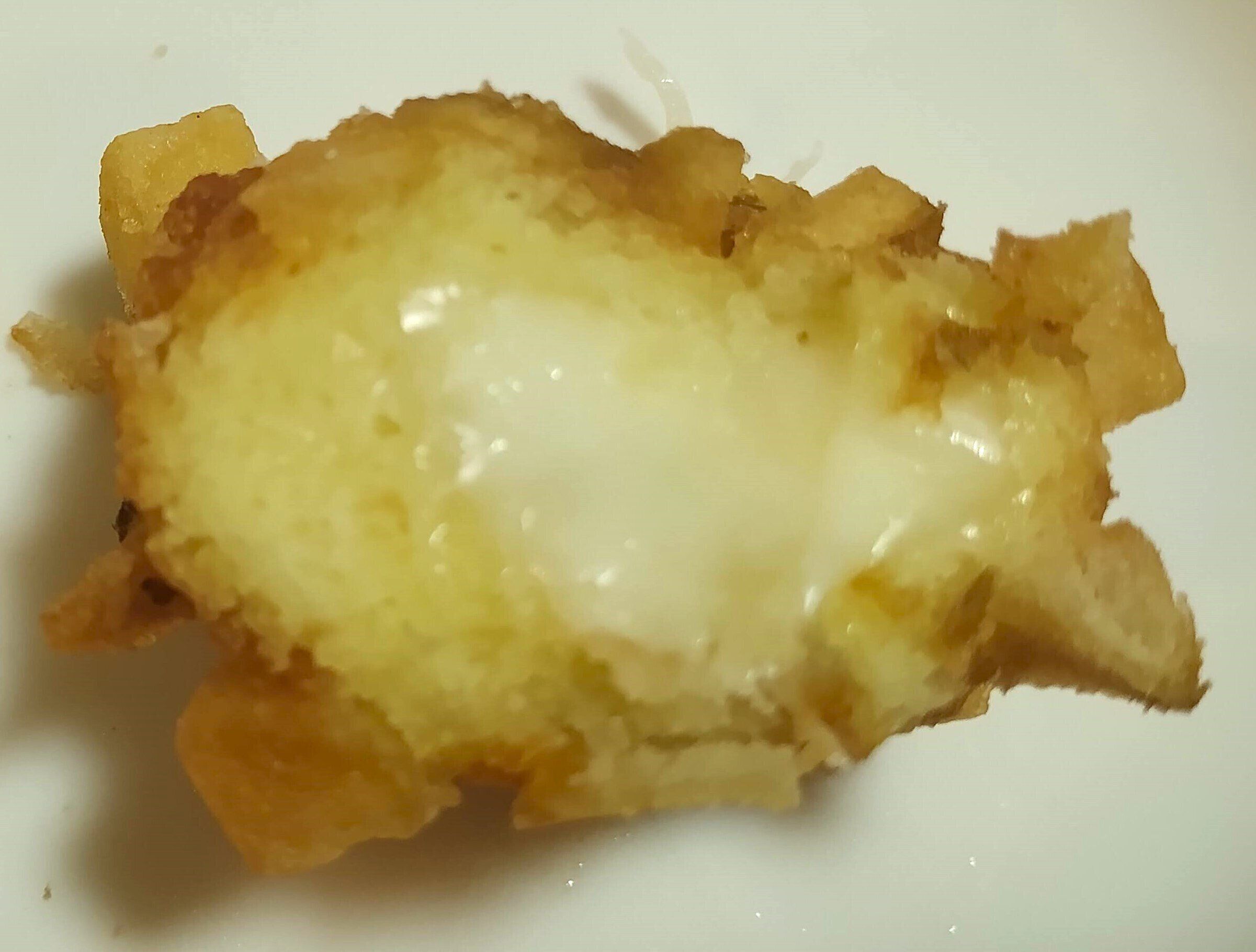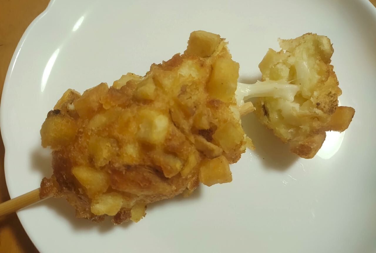 ほくほくのポテトが入った生地は少しカリッとしています。まさに食べたかった韓国のハットグ!ハットグというと、ソーセージが入っているものもありますが、こちらはモッツアレラチーズのみ。断面を見ると、たっぷり入っています。