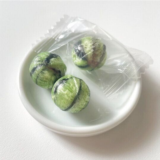緑色のヘタがついた可愛らしいデザインの「塩トマト飴」。お店で見つけたときは、意外な組み合わせに驚いた筆者。しかし、口に入れるとトマトの爽やかな甘さと塩気がクセになるおいしさ!甘さもしょっぱさも控えめで、大人向けのキャンディとしておすすめです。