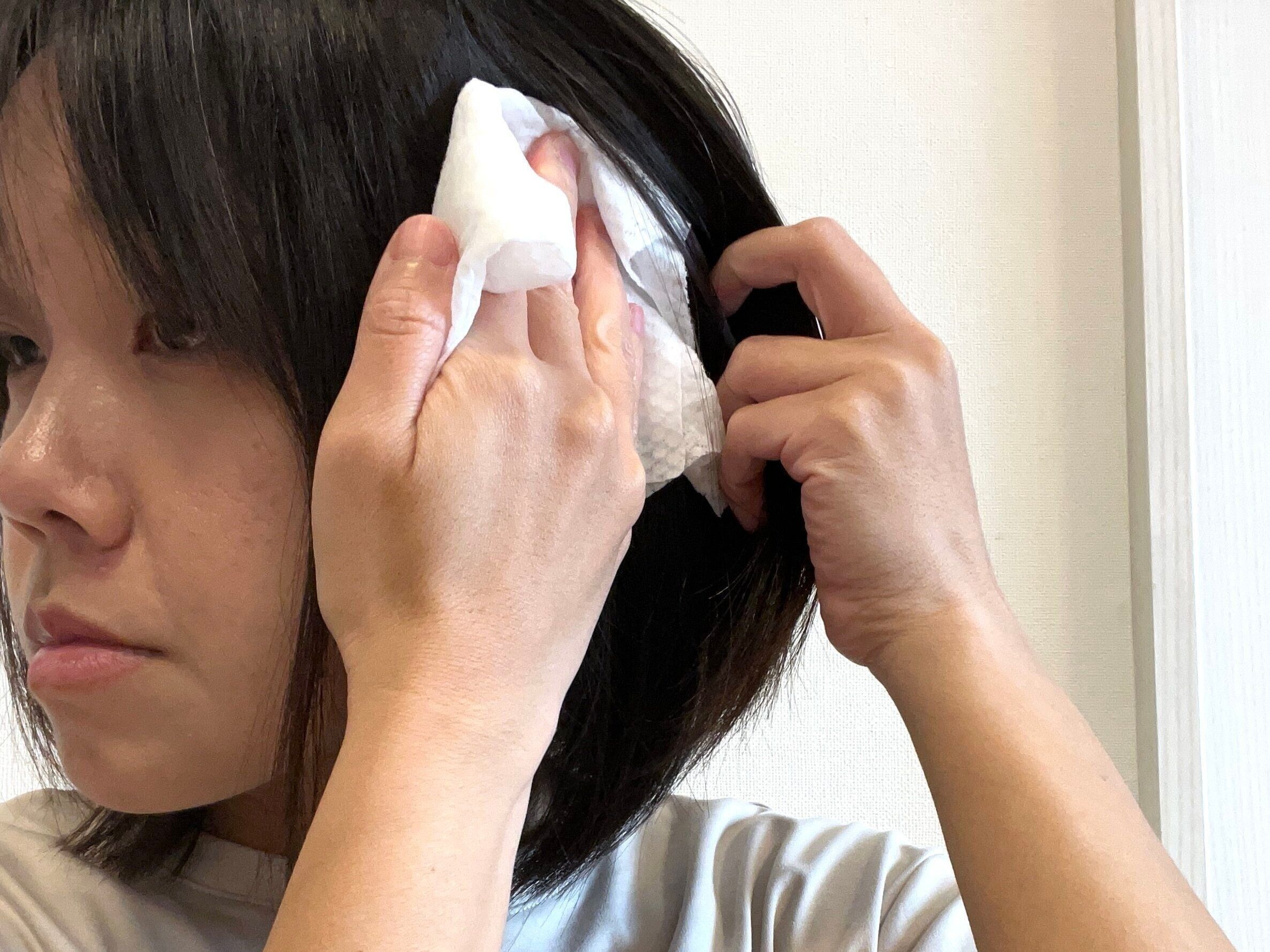 実際に汗をかいたあとに頭皮と髪を拭きとってみました。