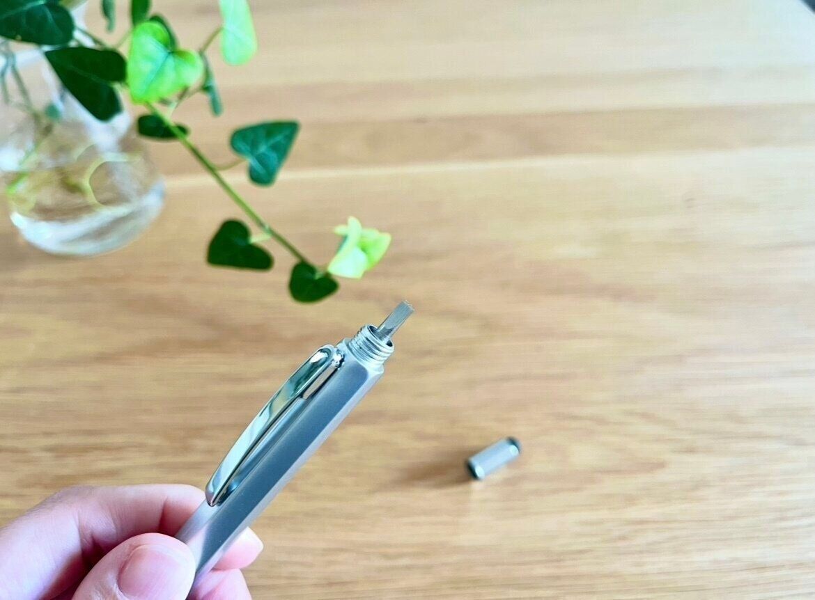 まず1つ目の機能は、ボールペン。ボール径は1.0mmで、インクは油性。グリップ部分を回して、ペン先を出して使用します。
