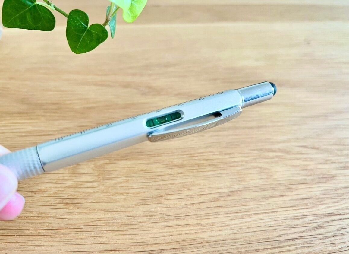 ペンの側面中心部に水平器がついていて、水平器に入っている気泡が線と線の真ん中あるかどうかで、傾いているか傾いていないのかを簡単に測定することができます。絵を飾るときや、DIYなで壁に棚をつけたいときなどにあると便利です。