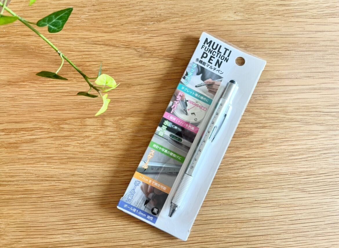 ご紹介するのは、ダイソーの「多機能マルチペン」という商品。今までも多機能なペンは販売されていましたが、コレは群を抜いて凄いんです。なんと1本で5役の機能がついているペンなんですよ!しかも110円という破格のお値段で販売されているんです。