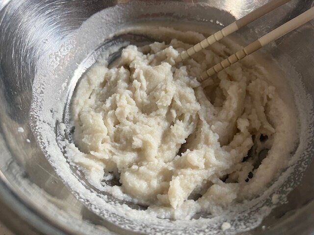 水を入れた直後は混ぜてもずっとこんな感じで、天ぷら粉ぐらいの固さでした。あれ?これで大根餅になるの?