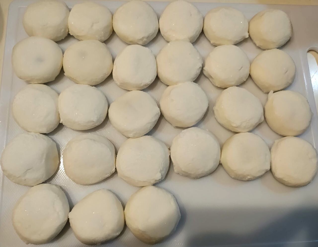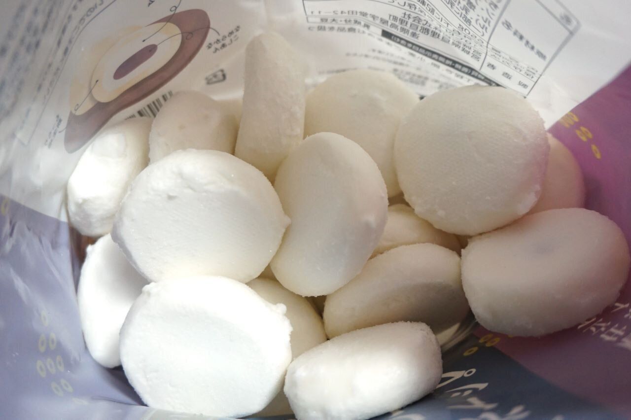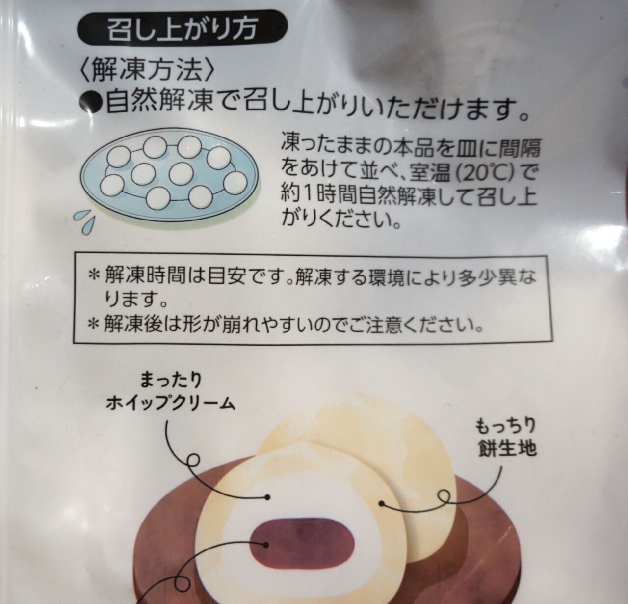 凍ったままのホイップクリーム大福こしあんを室温(20°c)でおよそ1時間自然解凍していただきます。半解凍くらいで食べてもおいしいですよ。我が家の子どもたちはむしろ半解凍のほうが好みだったようです。