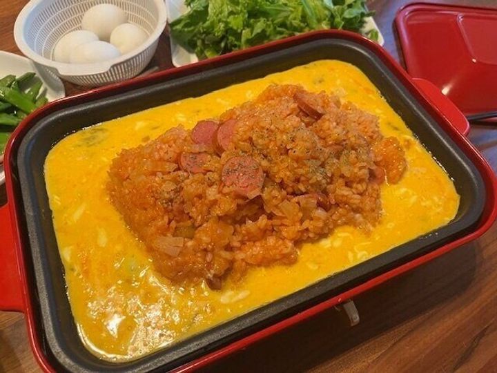 チキンライスの周りにバターを引き、溶き卵を流せばあっという間にホットプレートオムライスのできあがり!