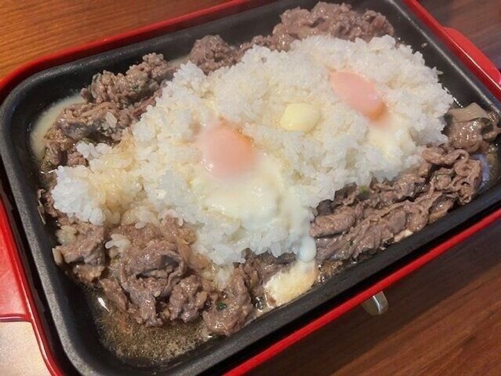 - 味付け肉を焼いただけなのに、見た目も華やか簡単ホットプレート焼き飯