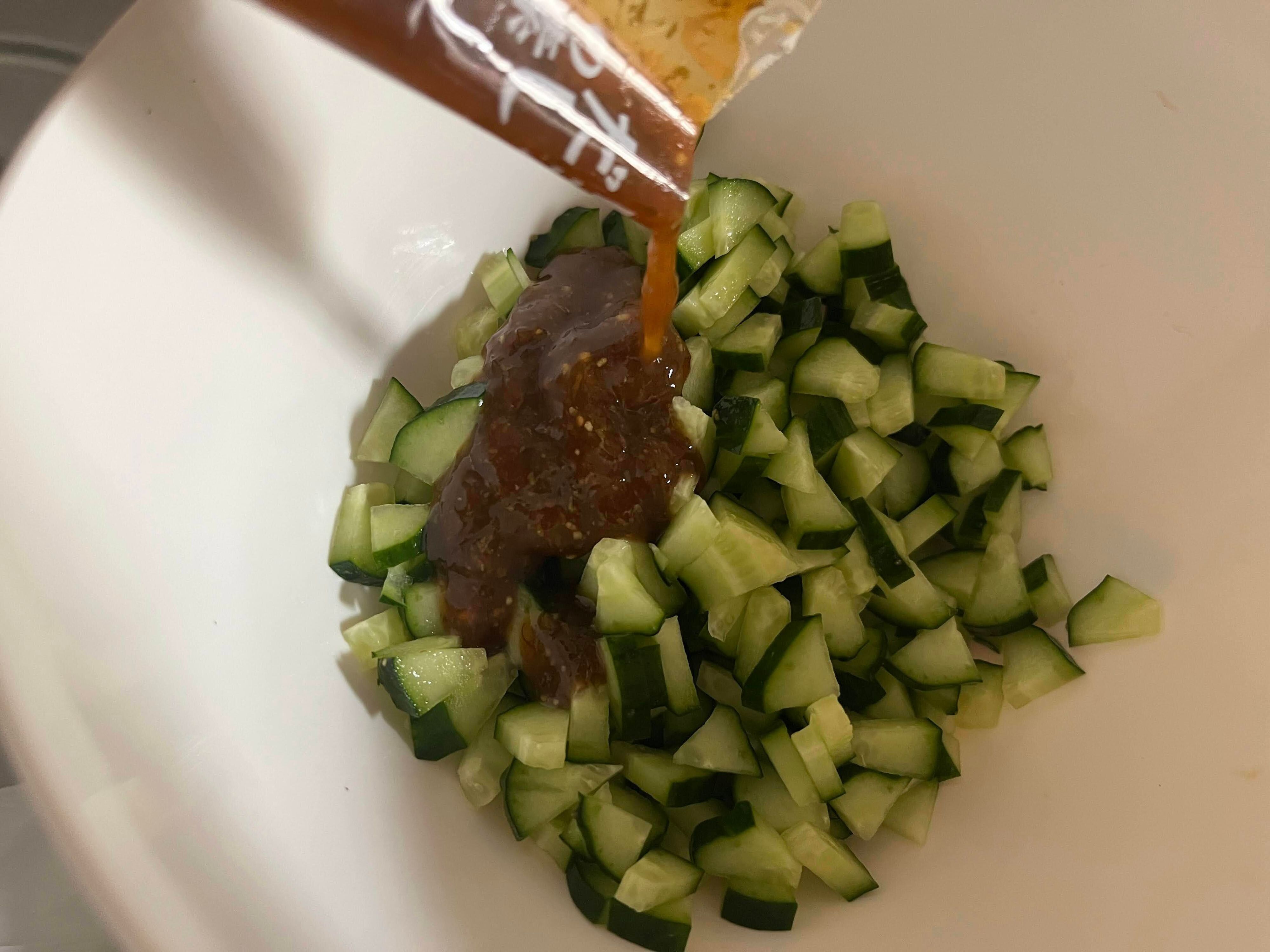 きゅうりとたれをよく絡めたら完成です!よく見ると大葉が入っていてとても良い香りがします。