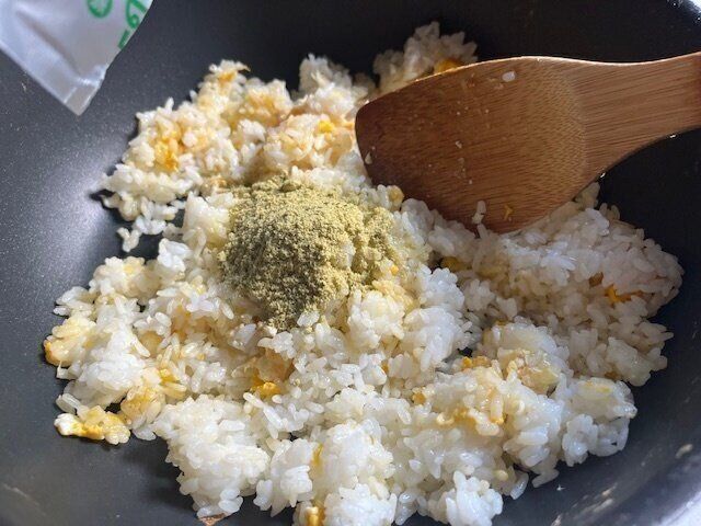卵を炒めて、ご飯を入れるだけ。そこにこの「グリーンカレーチャーハンの素」を入れます。