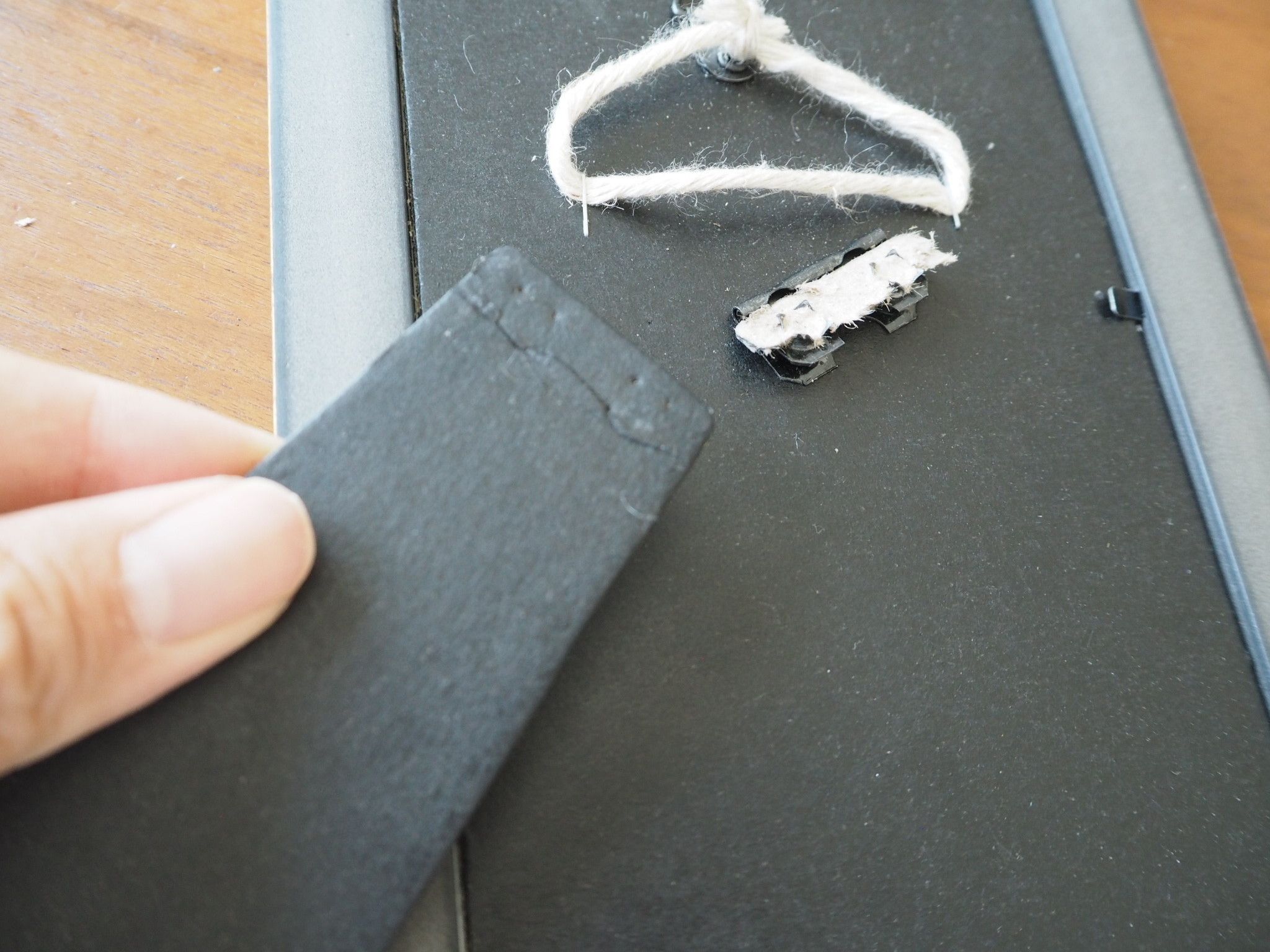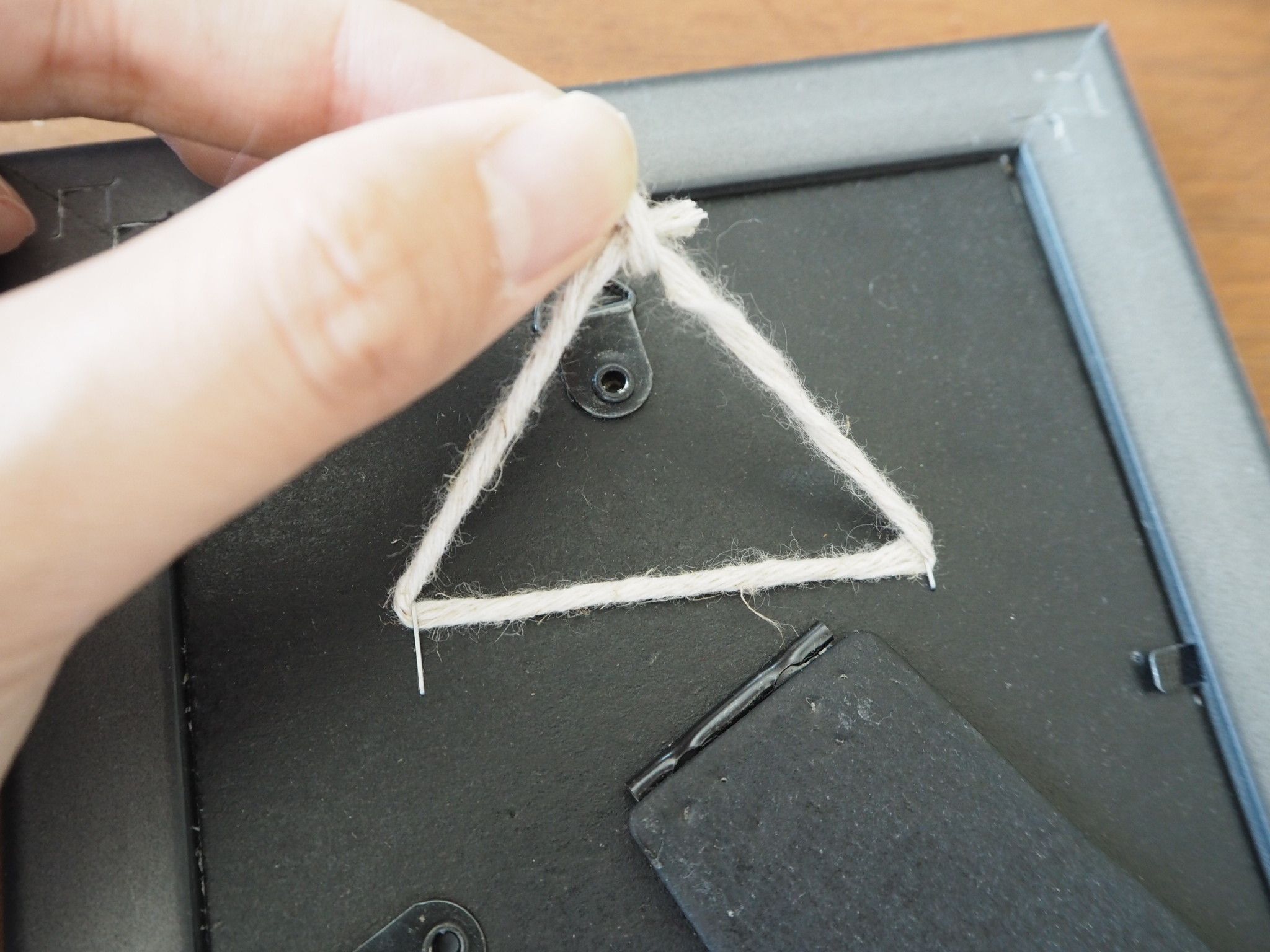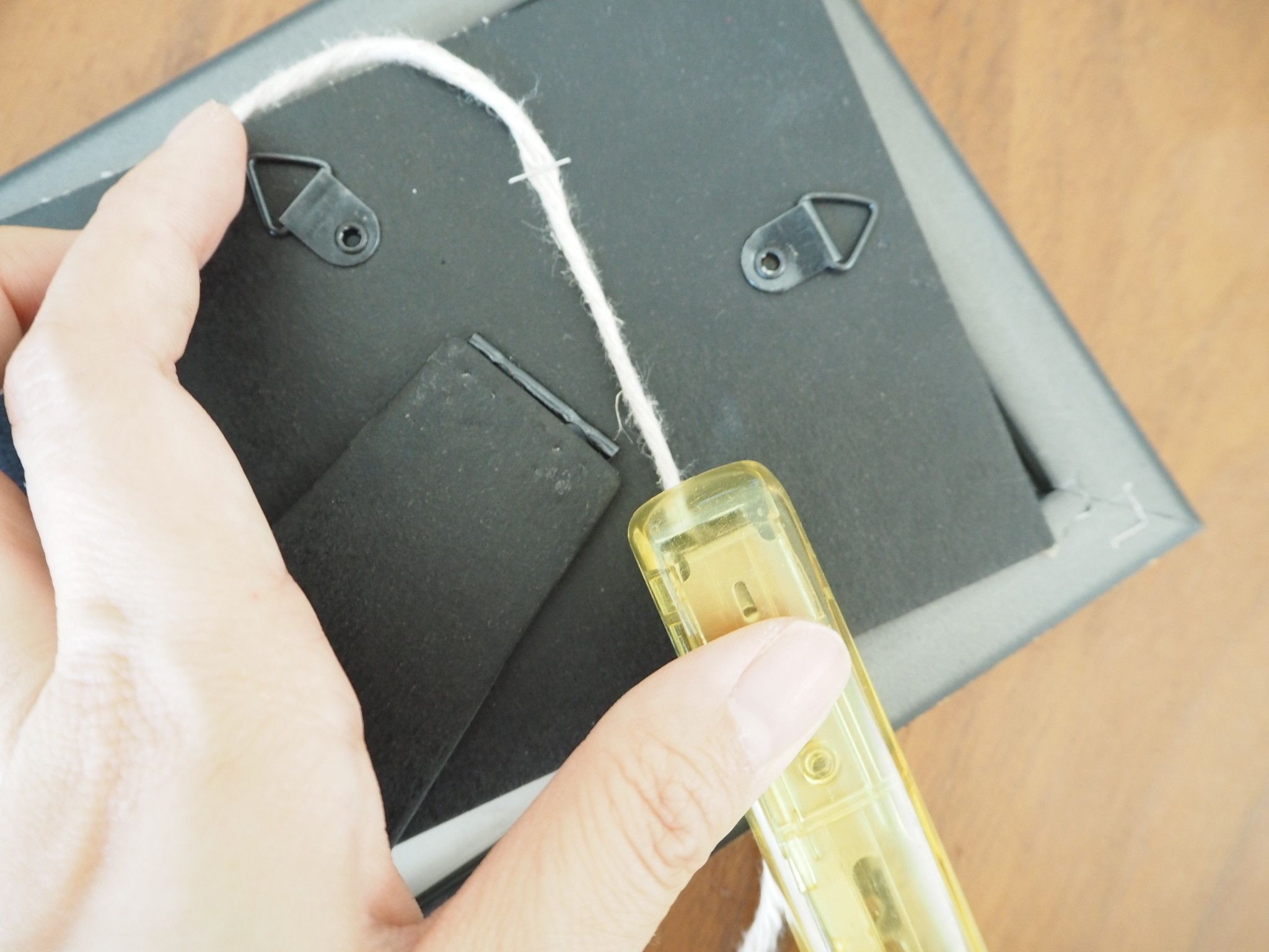 100均のフォトフレームは立てかけるタイプのものが多く壁に引っ掛ける部分がないものも。そんな時は自分で紐を後ろ側に取り付けましょう。