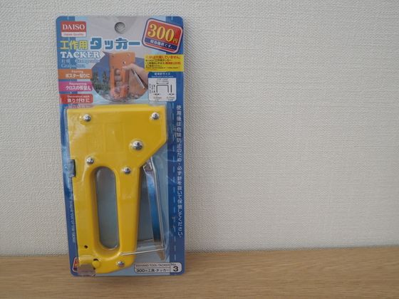 タッカーとはホチキスの大きくなったもの。DIYするときに重宝します。DAISOの工具売り場に売ってます。「工作用タッカー」300円(税抜)