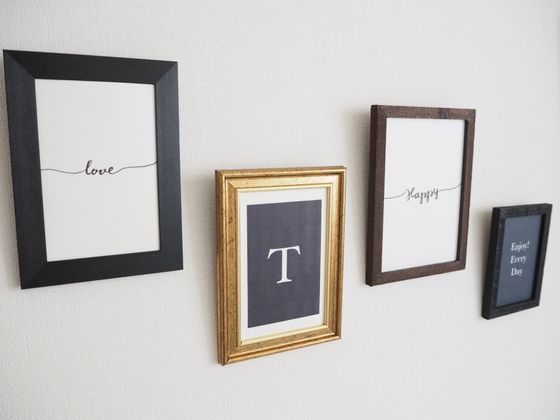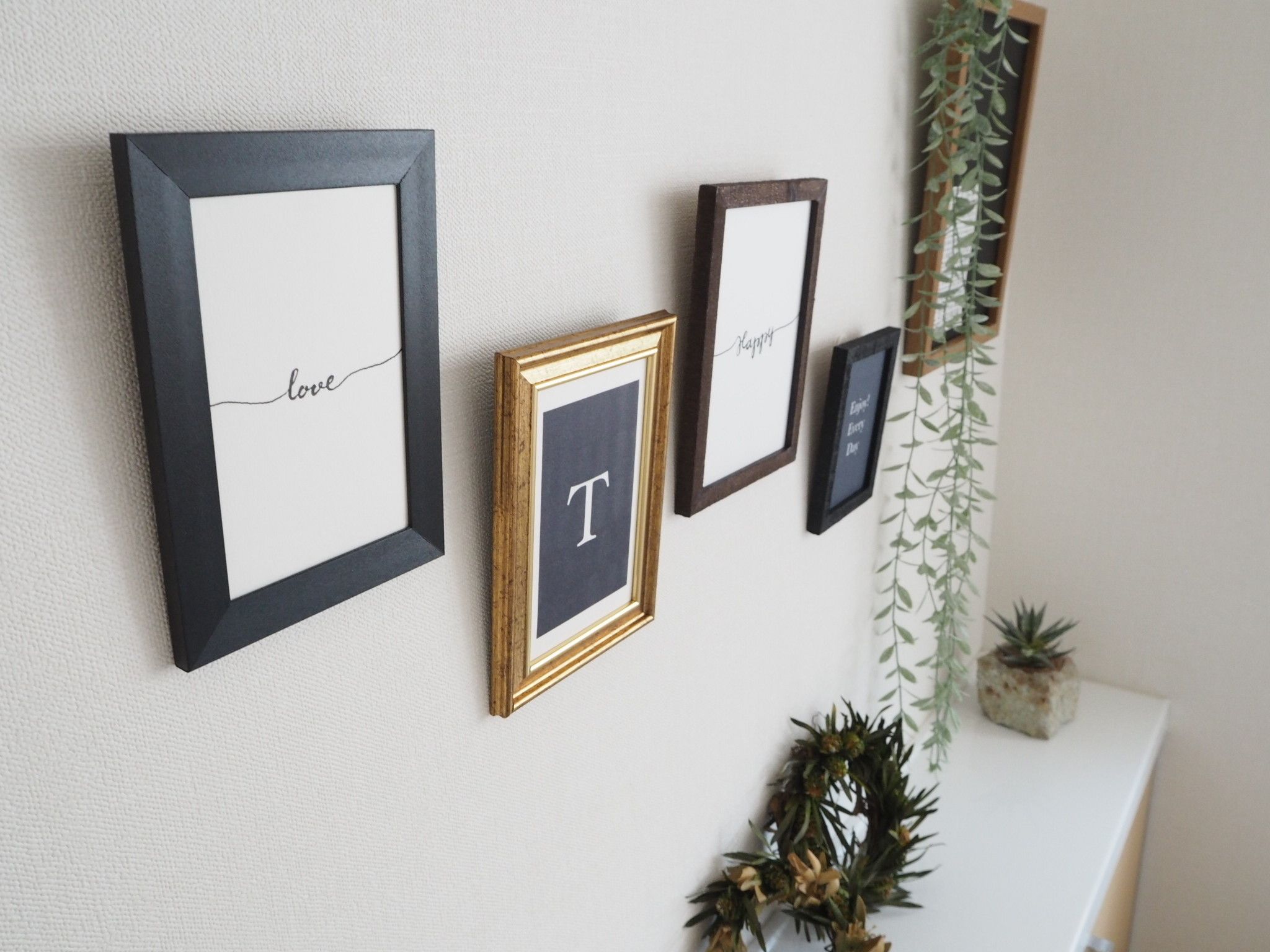 フォトフレームの準備ができたらバランスを見ながら壁面に飾っていきます。賃貸などで画鋲などが使えない場合は貼ってはがせるテープでつけるフックもホームセンターに売ってますよ。
