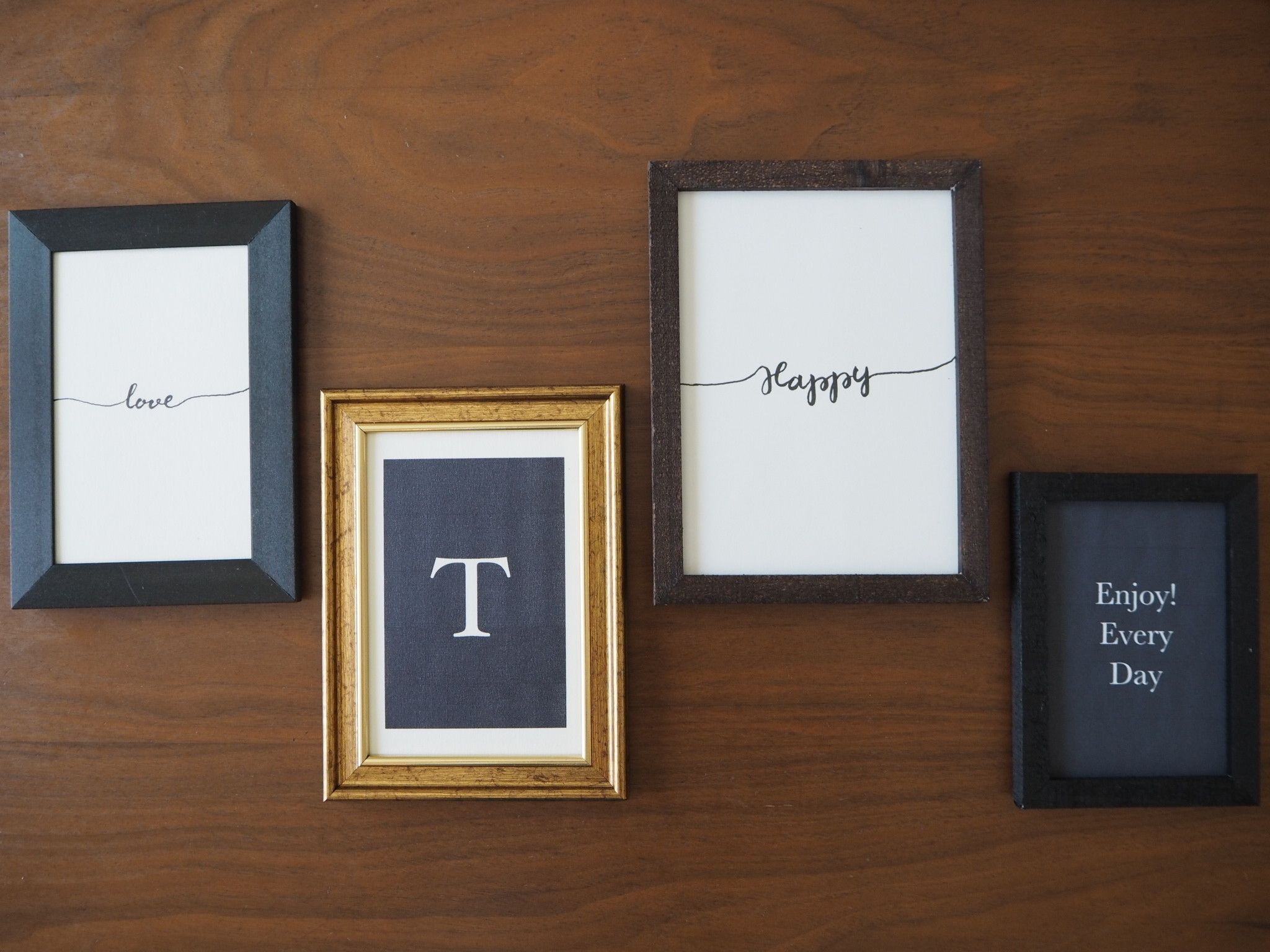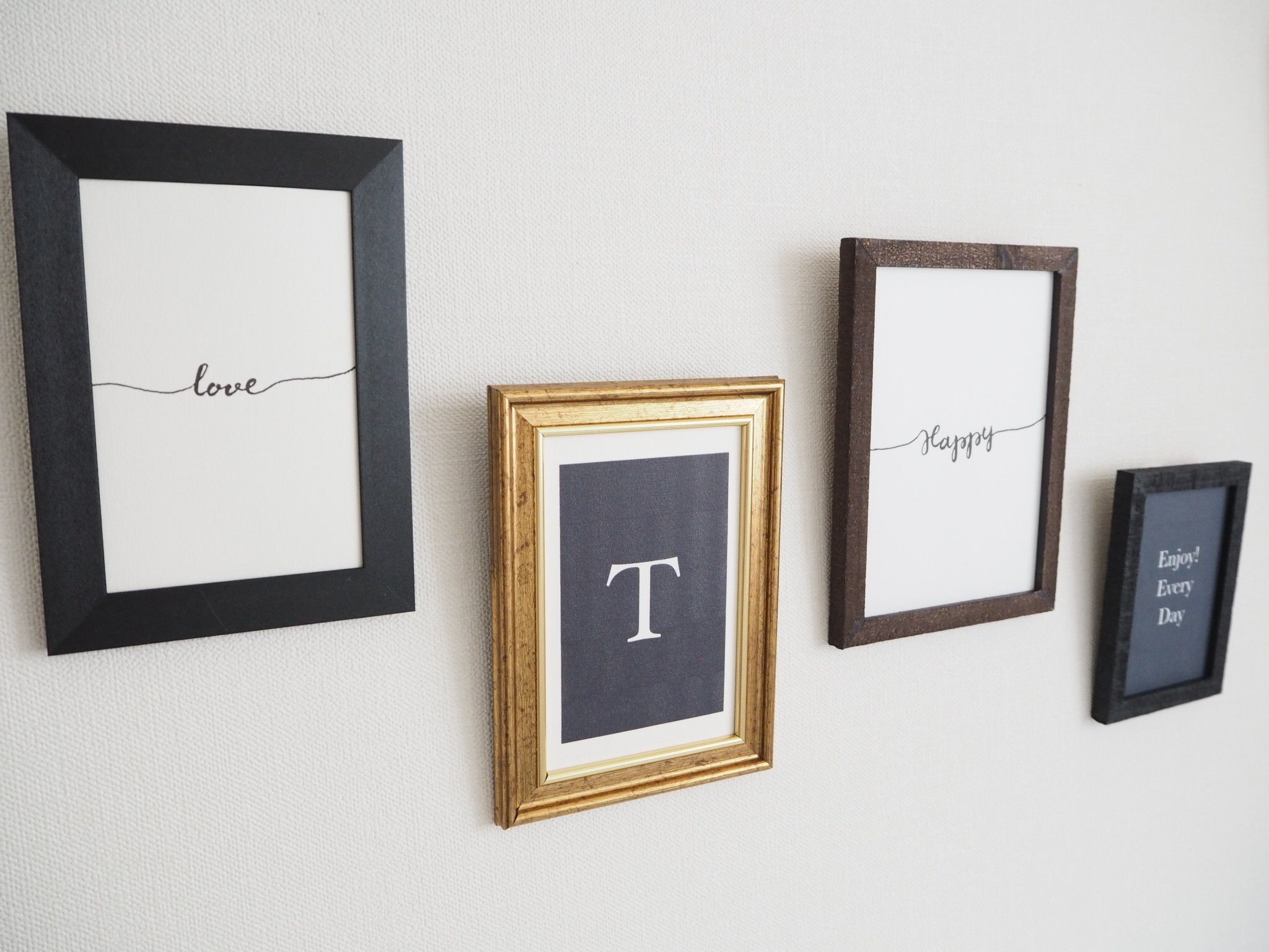 フォトフレームの中に入れるのは写真だけじゃありません!家族のイニシャルのアルファベットを印刷したもの、好きな文言、フリーの可愛いイラストなどフォトフレームに入るサイズに合わせて印刷して飾っちゃいましょう。今回はモノトーン×文字で統一。