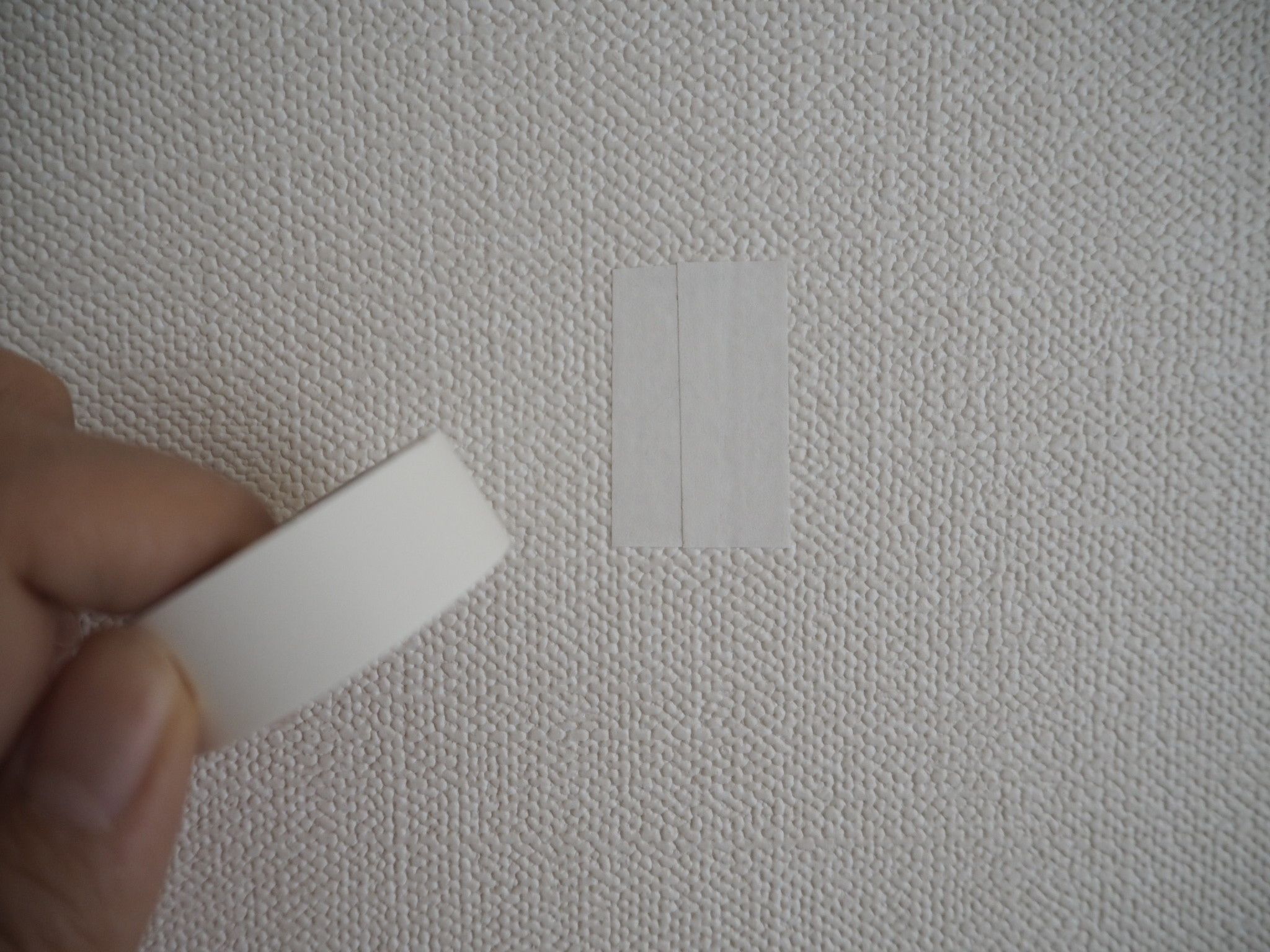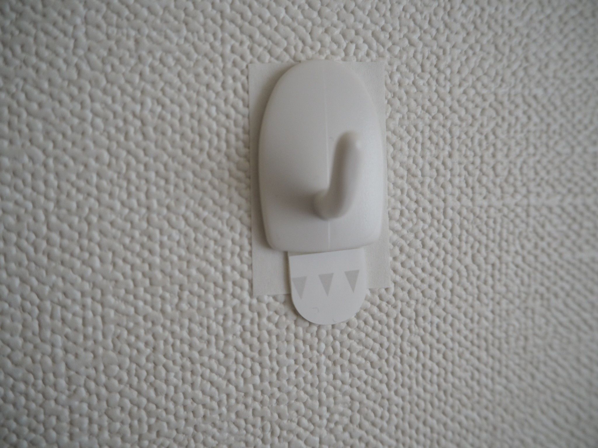 貼ってはがせるテープでつけるフック。壁紙によっては傷がついてしまうことも。マスキングテープなどで下地を作っておくと傷もつきにくいです。壁紙によってはマスキングテープでも剥がれてしまうものもあるので目立ちにくいところに貼ってテストするのがオススメ!