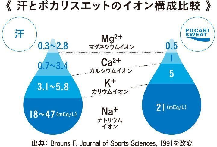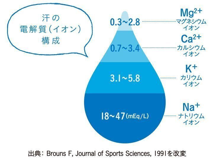 だから熱中症対策としてしっかり汗をかいてカラダの熱を逃がすことはとても大切。そのためには、汗のもとになる体液量をしっかり維持して、カラダが潤った状態をキープしておくことが大切です。みなさんは、汗や、汗のもととなる体液は、真水ではないことを知っていますか。実は、ナトリウムなどの電解質が含まれているんです。