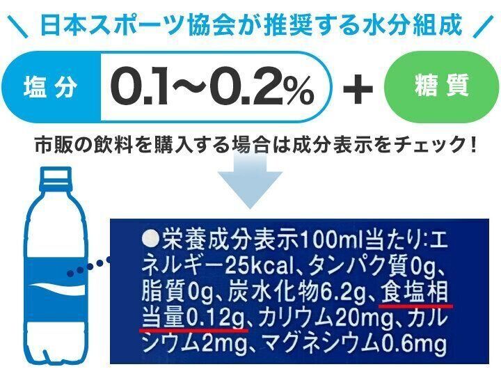 日本スポーツ協会によると、熱中症対策飲料として推奨されているのは、塩分濃度が0.1~0.2%の飲料(食塩相当量:0.1~0.2g/100ml中)。市販の飲料を購入する場合は栄養成分表示をチェックしてみて。実はポカリスエットは熱中症対策として推奨されている塩分濃度のドリンク。また、糖質が含まれていることもポイント。適度に糖質があることで、よりスピーディーにカラダに吸収されるんです。
