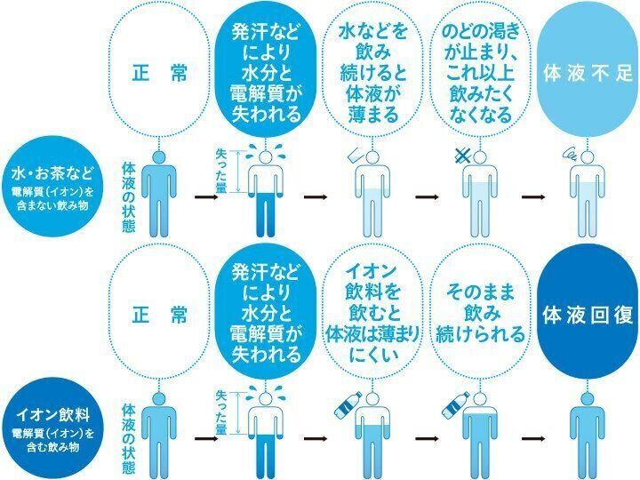 カラダには体液の濃さを保とうとする働きがあります。体液には電解質が含まれているため、汗をたくさんかいたときなどに電解質を含まない水やお茶で水分補給を続けると、図のようなことがおこり、体液量が十分に戻らないこともあります。発汗時は水分だけではなく電解質が失われないよう、電解質を含む飲料でカラダの水分量をキープしておくとよいでしょう。