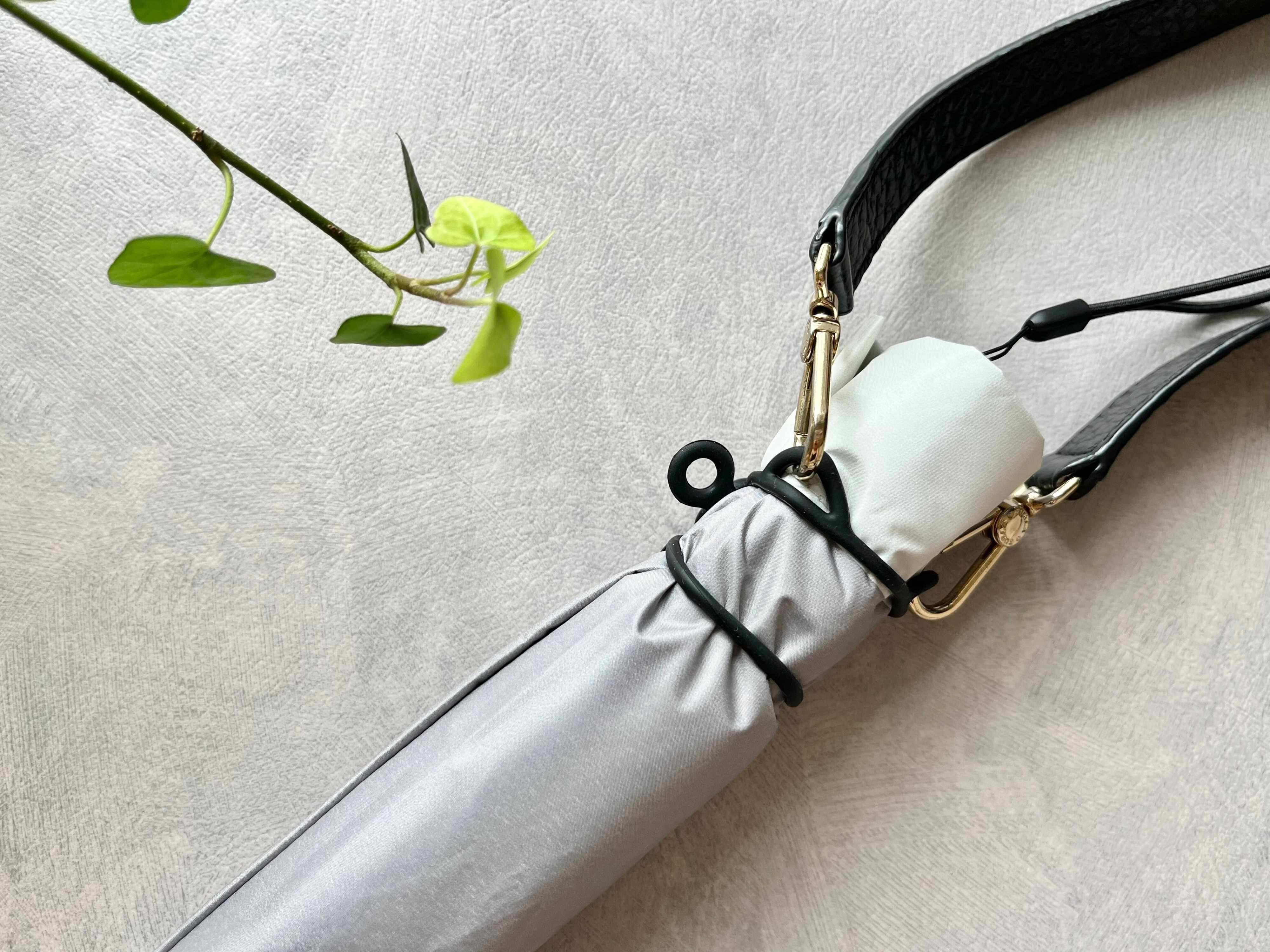 ショルダーバッグのように肩掛けして折り畳み傘を持つこともできちゃうんですよ!