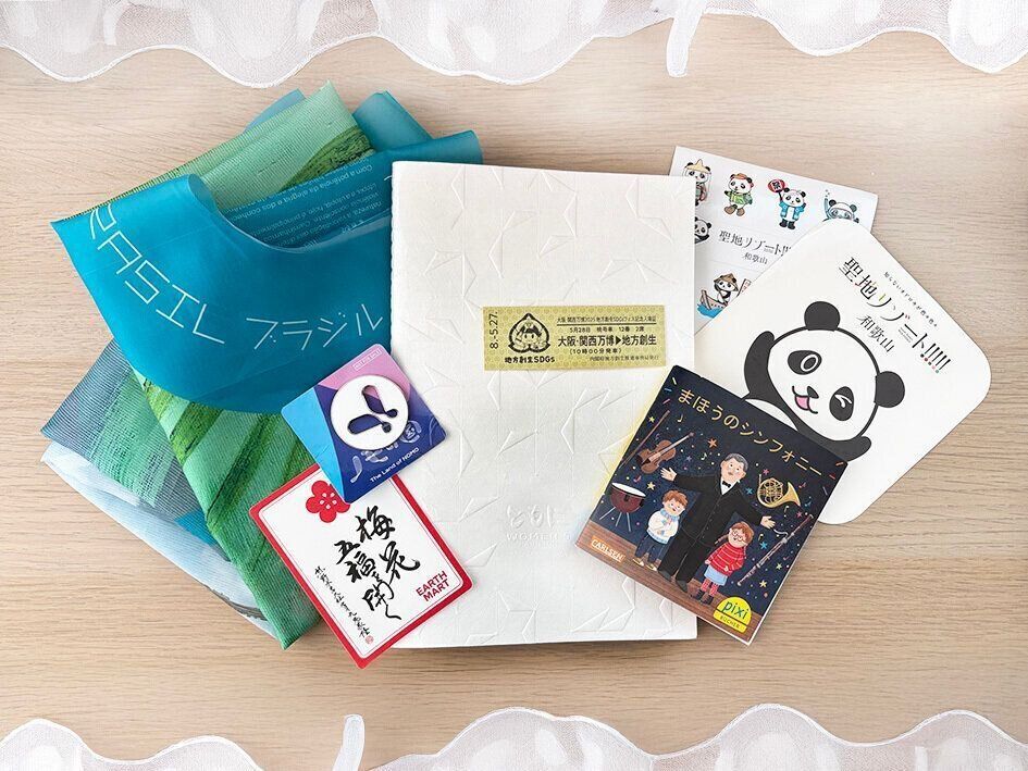 万博には、無料のノベルティ配布を行うパビリオンが多数あります。EARTH MARTでは、来場すると25年後に「万博漬け」(梅干し)がもらえる引換券をゲットできます。ノモの国では、庭園のQRコードを使用したゲームをクリアすると、ピンバッジがもらえます。