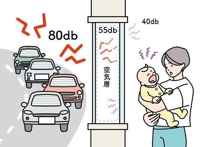 二重窓でできる空気の層には、騒音を抑える防音壁としての役割も。例えば、交通量が多い道路の騒音は80dbですが、内窓を付けると、室内に入る音は40dbまでダウン。外からの不快な音だけでなく、室内で発生した音が近隣に漏れることを抑えることができます。