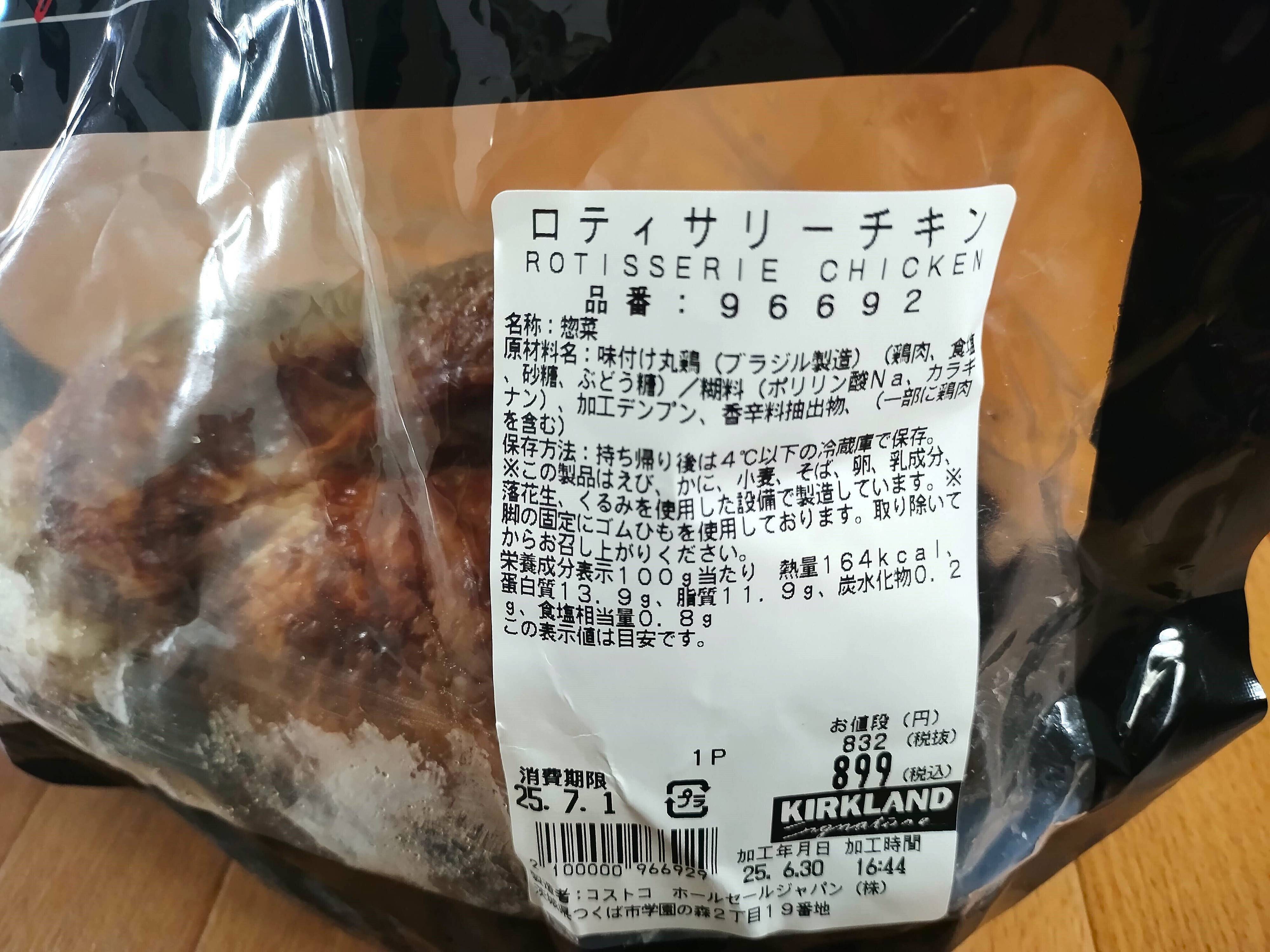 ロティサリーチキンの価格は、税込899円です。筆者が購入したものはおよそ1,300gありました。100gあたりの重さはおよそ70円と、パックのお肉よりも安い驚きの価格設定です。何度か値上げしていますが、それでも丸ごと1羽の鶏がこの値段で買えるのは信じられません。