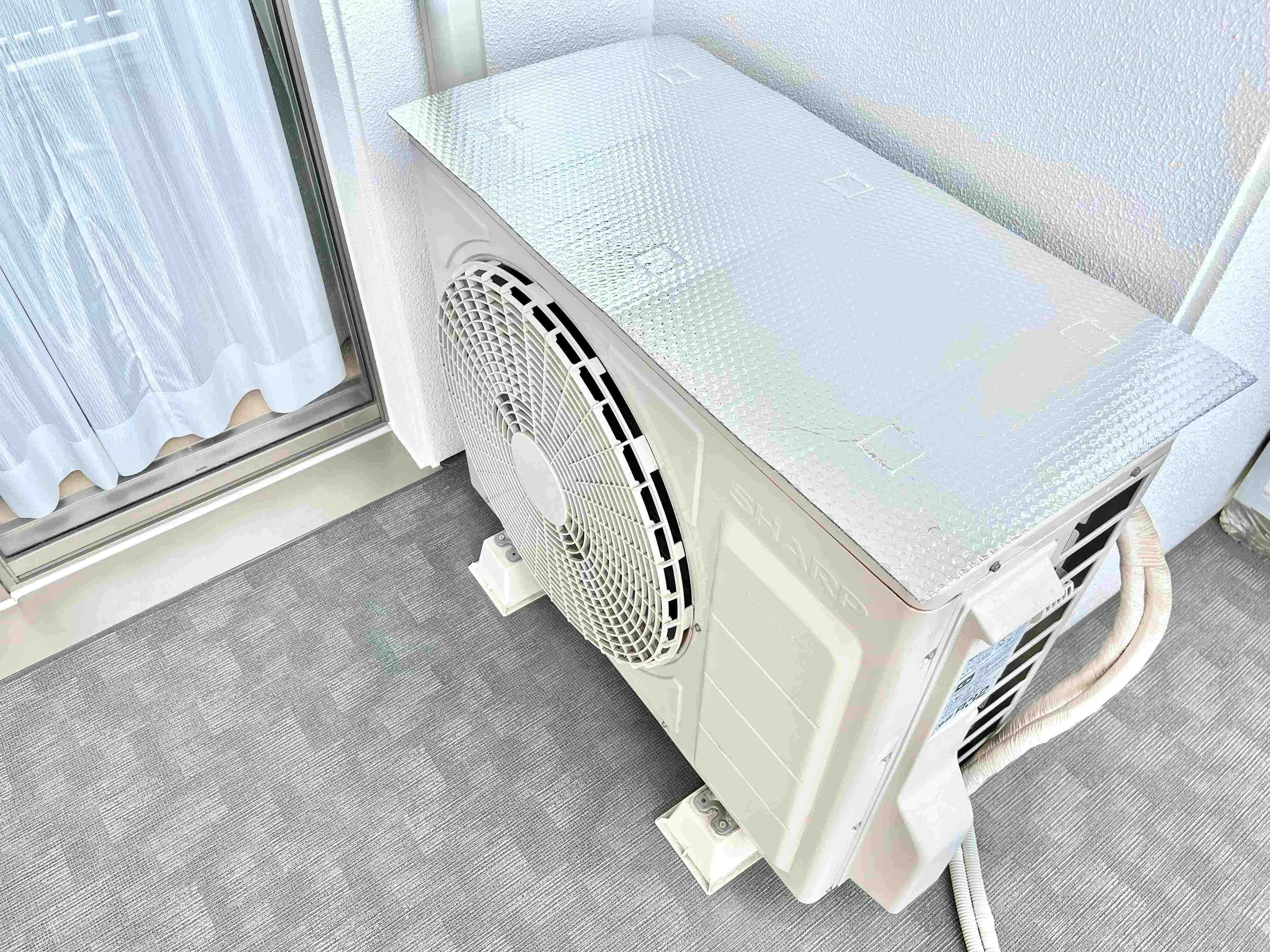 たったコレだけで、直射日光の熱からガードし、エアコンの室外機が熱くなりすぎるのを防止してくれるんですよ!