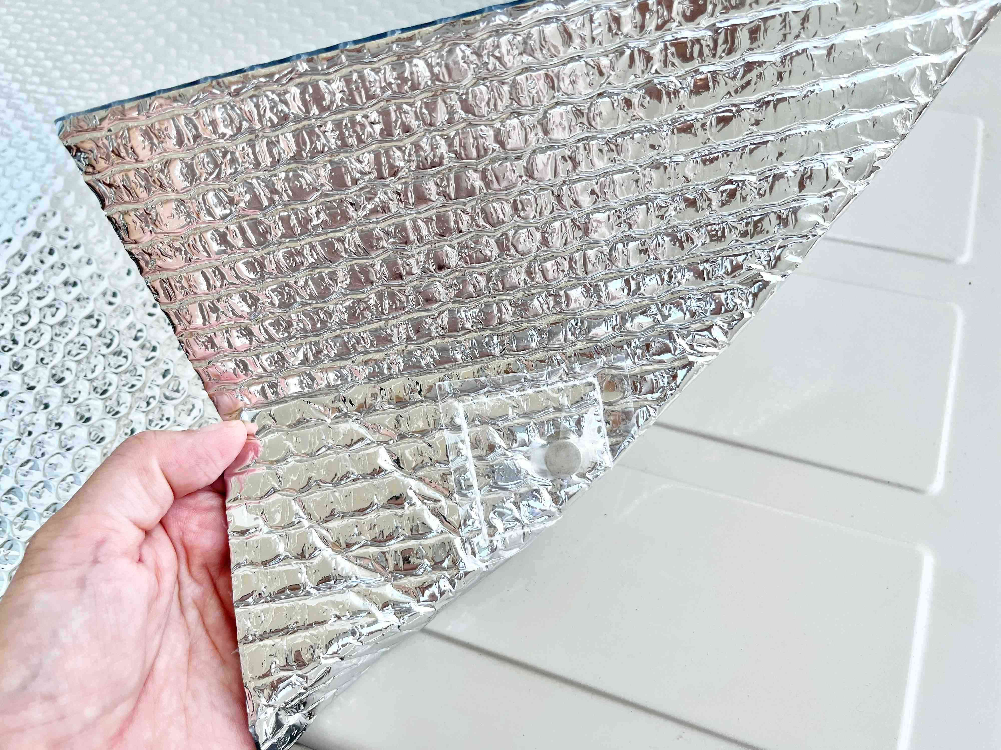 レジャーシートと大きく違う点は、マグネットがついているというところ。1枚に計6個のマグネットがついていて、コレが設置するときにいい仕事をしてくれるんですよ。