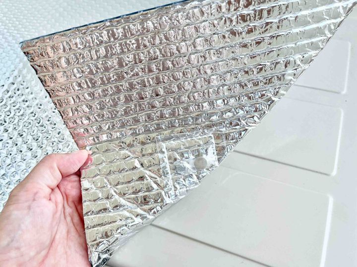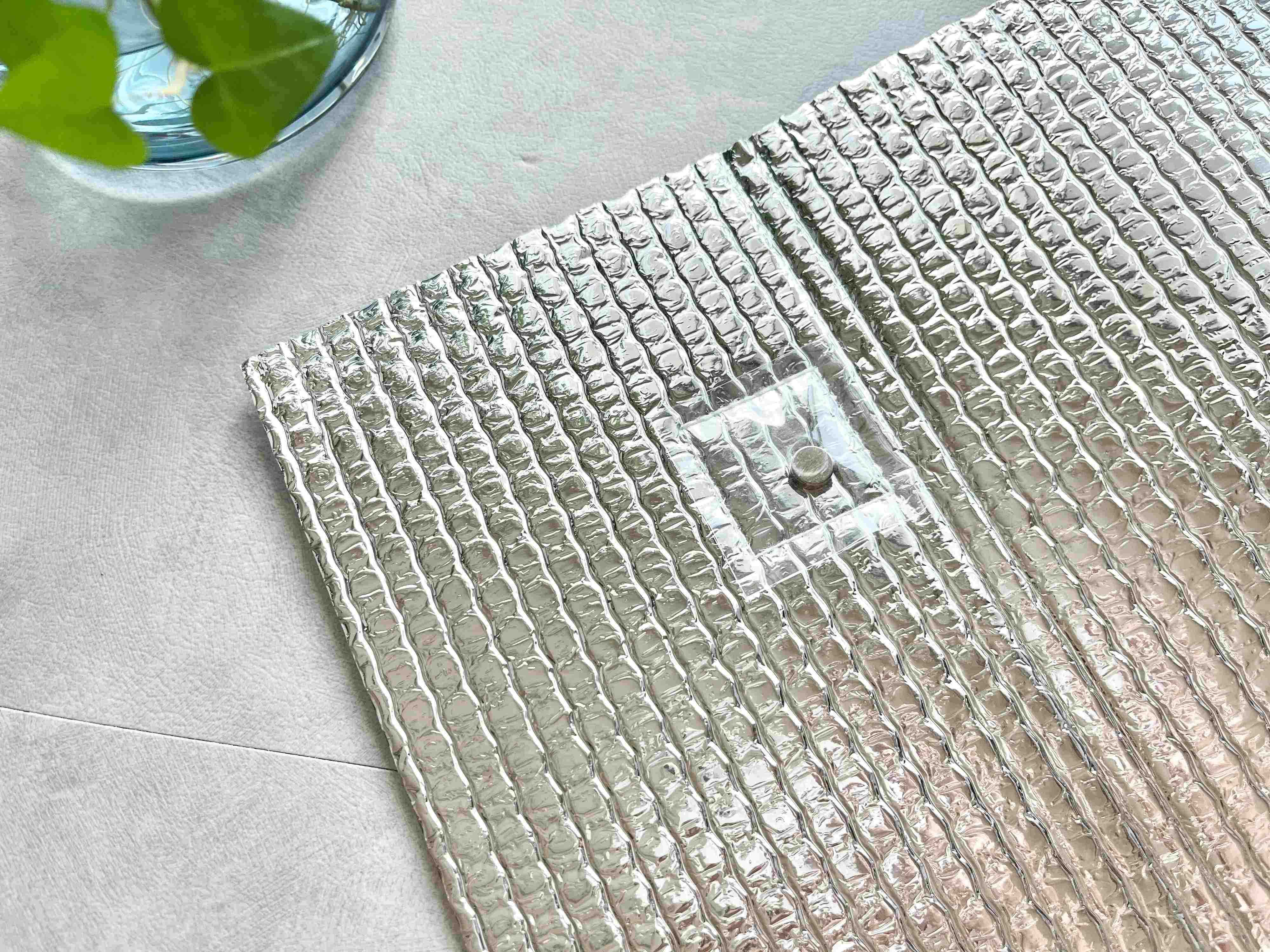 商品サイズは、約縦40cm×横80cm×厚み0.5cm。素材にはレジャーシートなどにもよく使われている、アルミ蒸着フィルムを使用しているので、見た目もまるで小さなレジャーシートのようです。