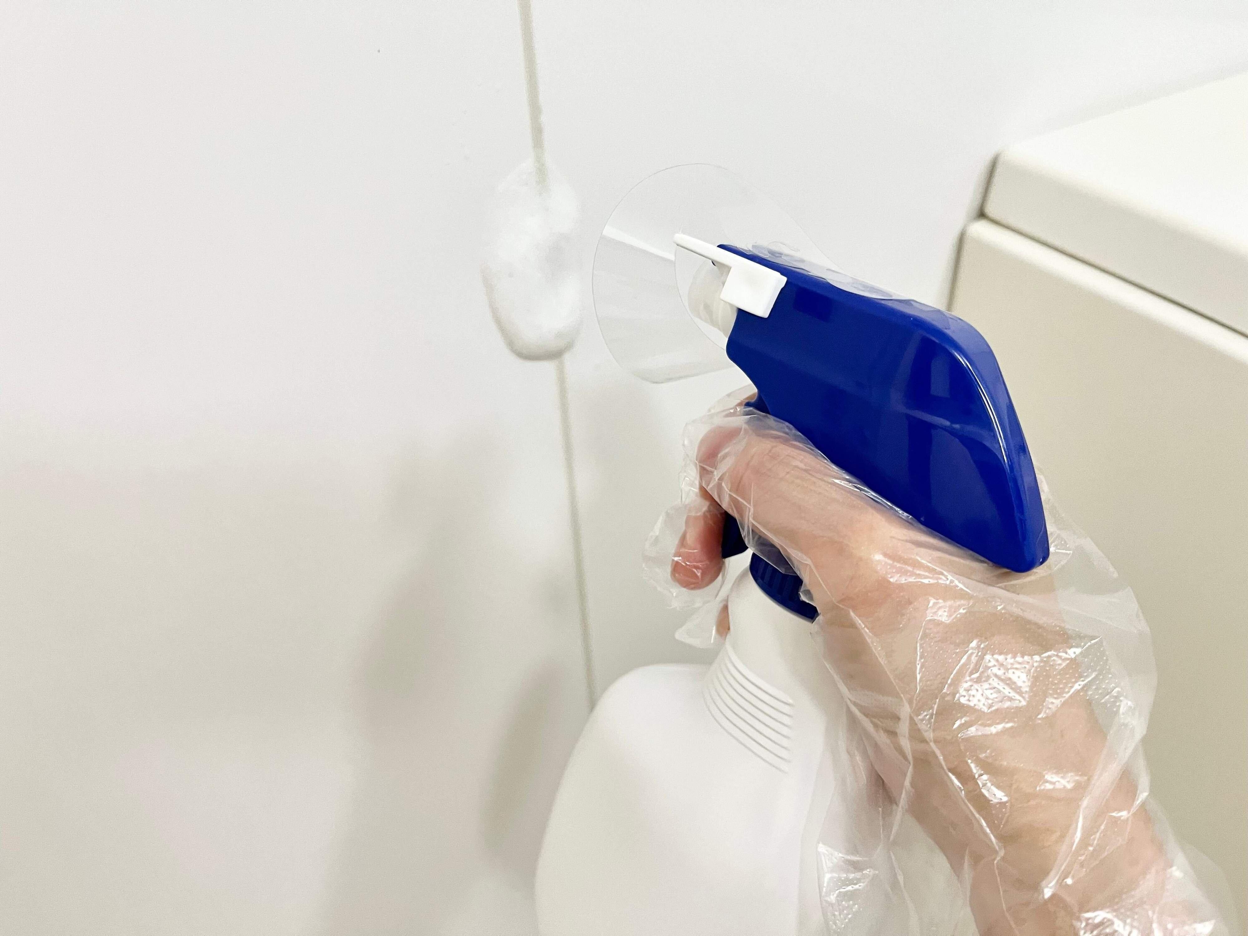 しかし、スプレー噴射後にシートを見てみると、本来なら手に垂れてしまっていたであろう液ダレが付いているのを発見!塩素系の強力なスプレー洗剤などは、ゴム手袋をしてお掃除するので、手に垂れてヌルヌルすることはありません。