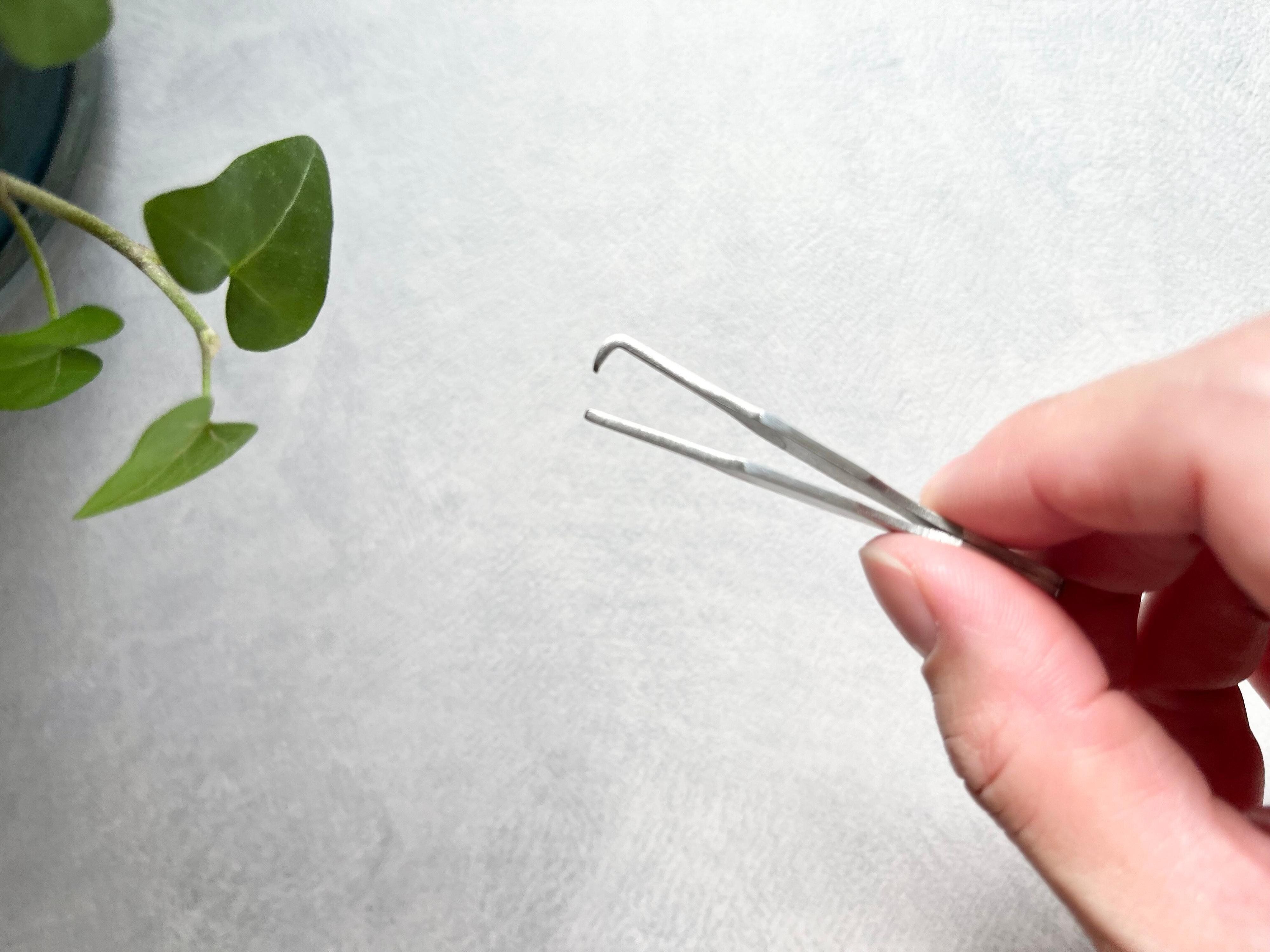 ですが、横から見るとよくわかりますが、一般的なピンセットとは少し違い、片方の先端が曲がっているのが特徴です。