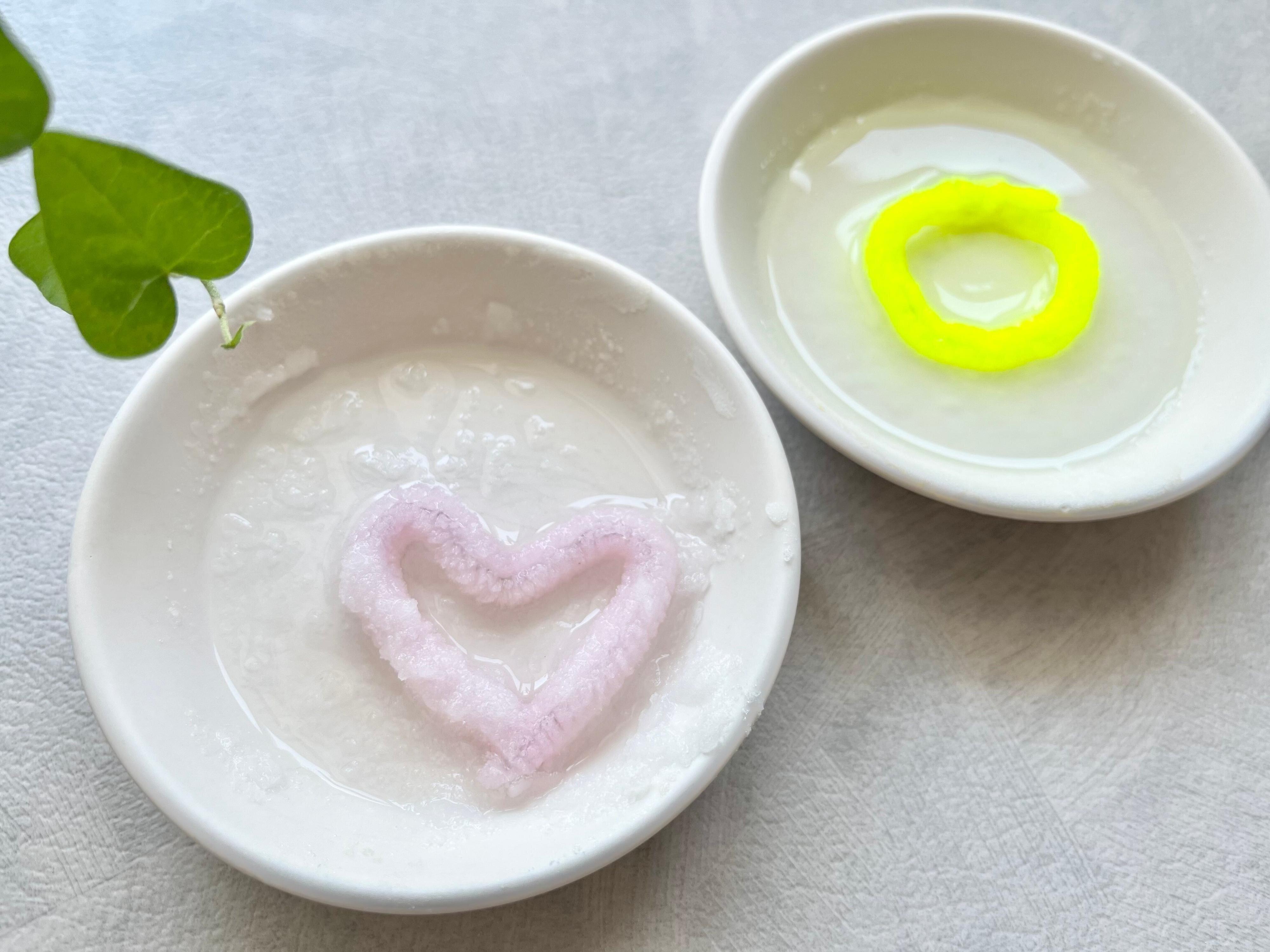 工程は、まずモールを好きな大きさに切って3〜4cmぐらいのオブジェをつくります。そして耐熱容器に水とパウダーを入れてかき混ぜて、電子レンジで温めてパウダーを溶かします。