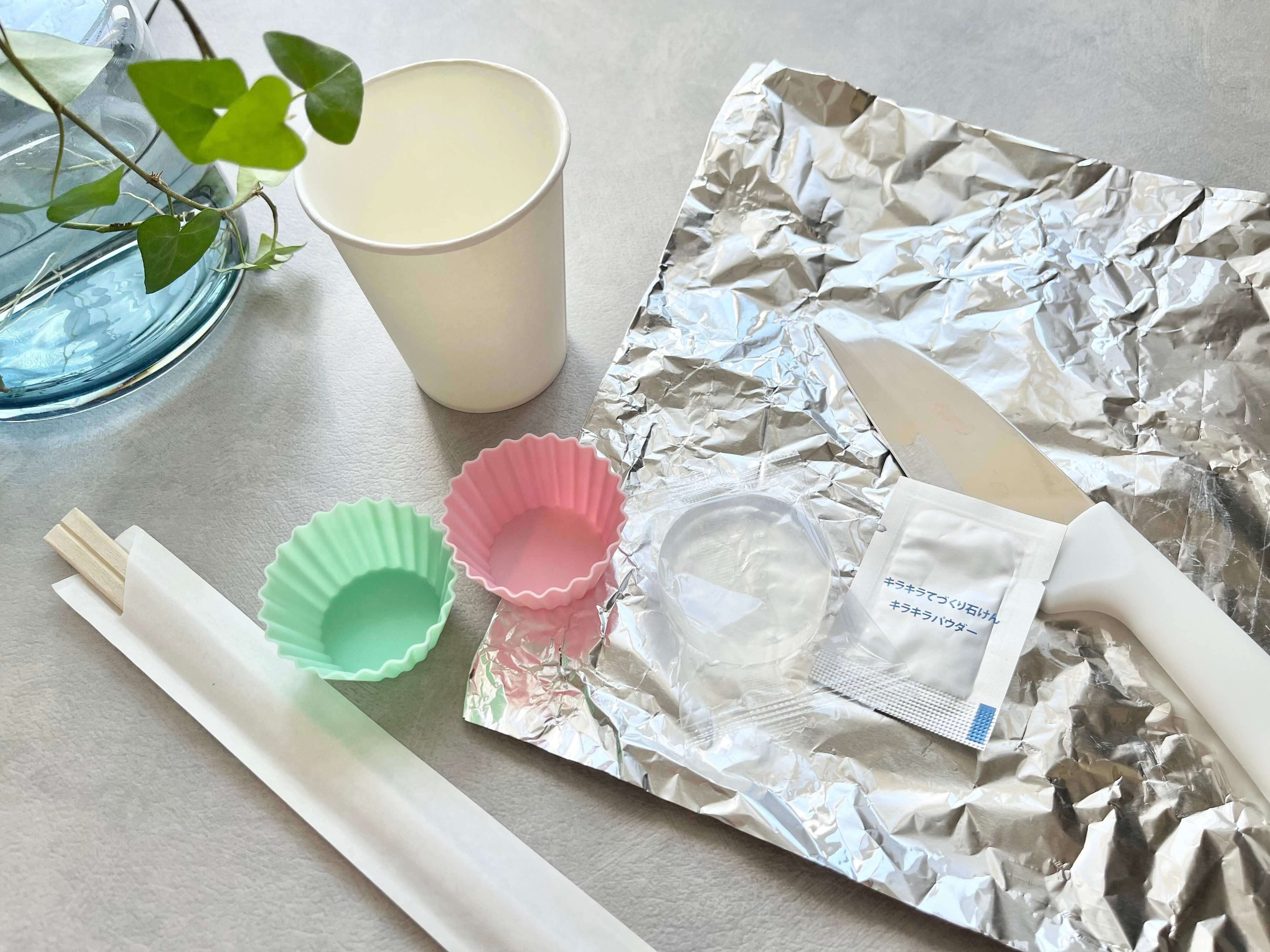 あとは紙コップやかき混ぜ棒(割り箸など)、アルミホイル、包丁やシリコーンカップのような柔らかい素材の型などの準備が必要です。