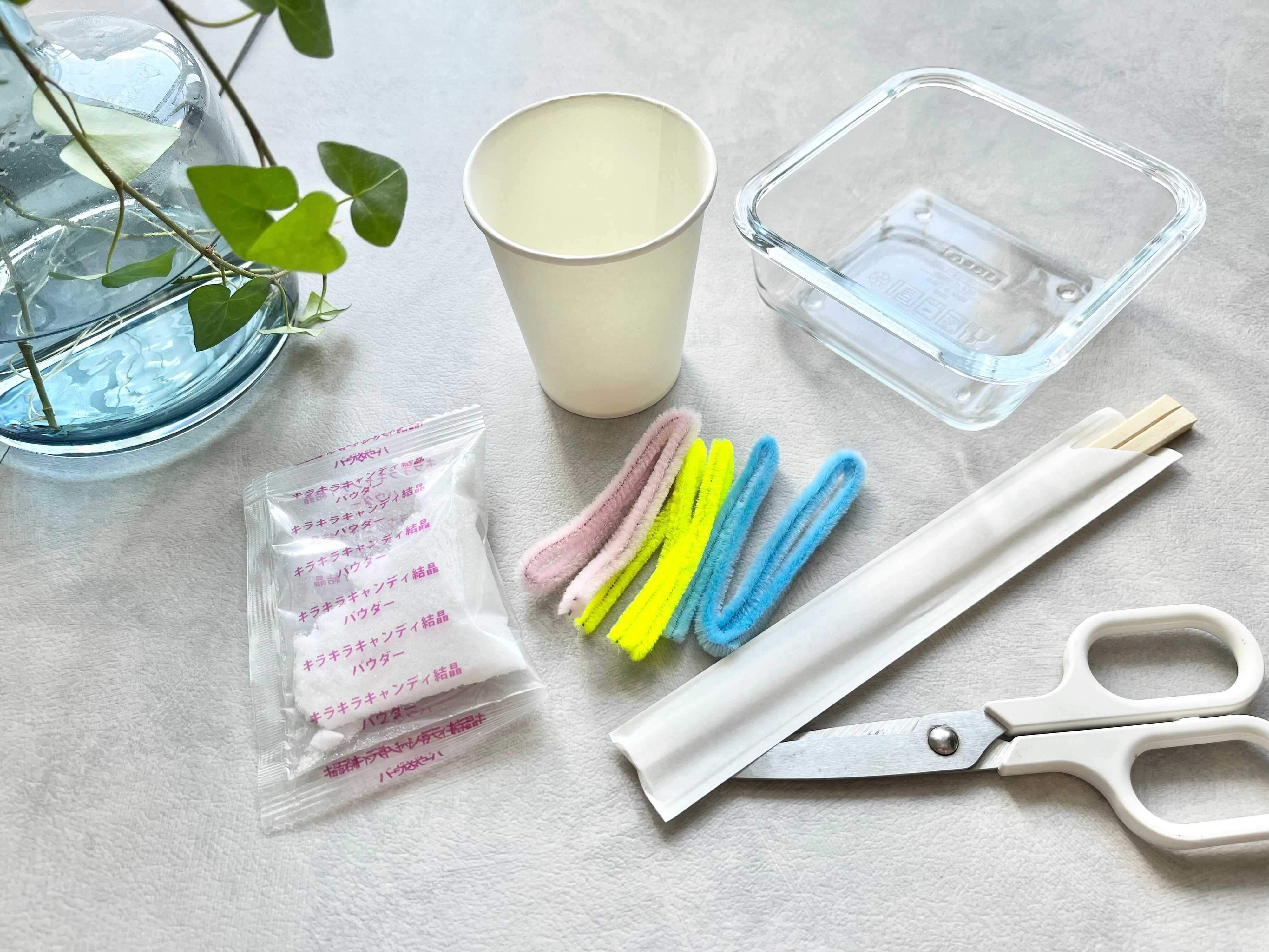 あとは水を入れたコップ、耐熱容器、はさみ、かき混ぜ棒(割り箸など)の準備が必要です。