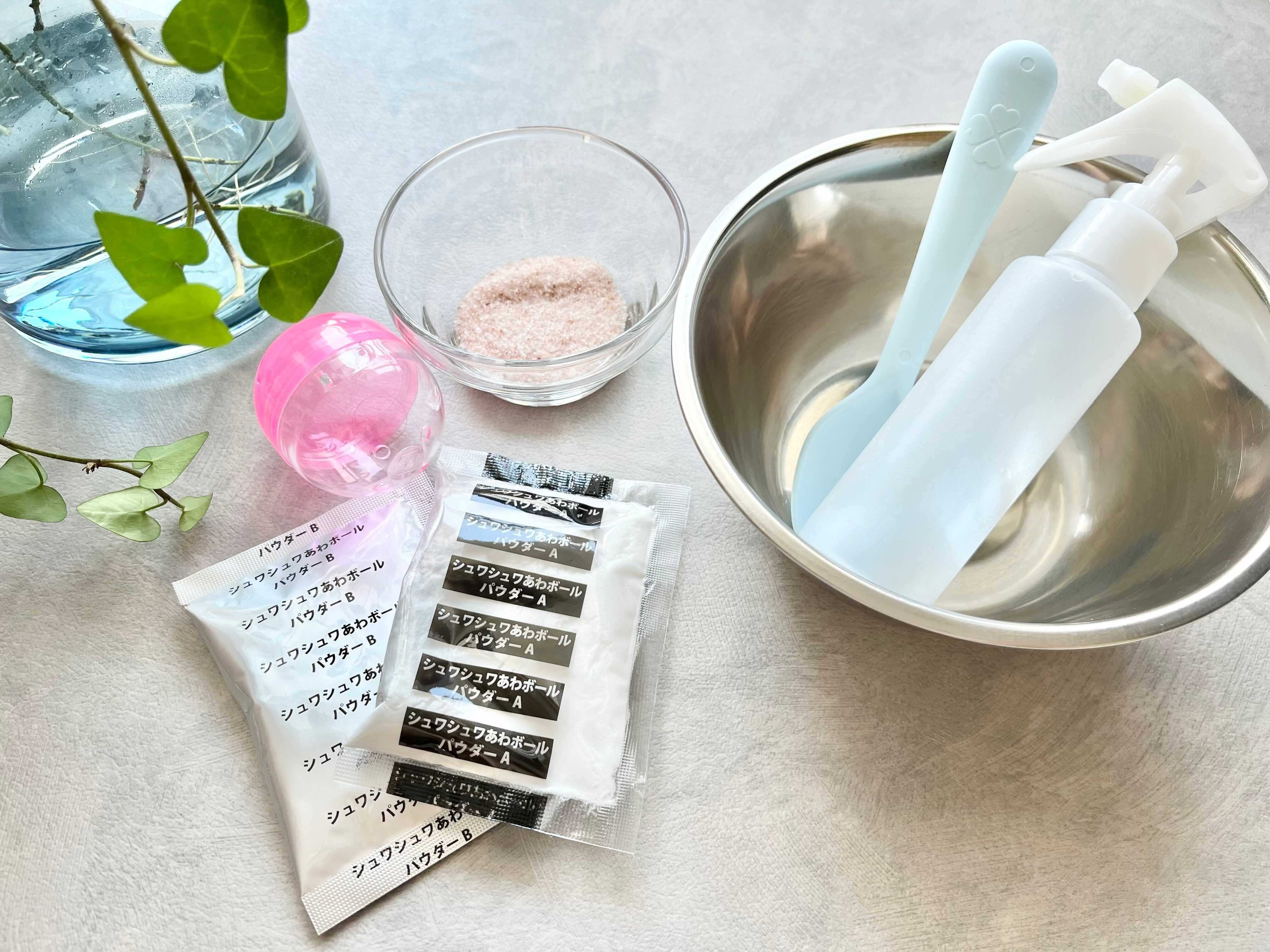 あとはボウルとぬるま湯を入れた容器、塩大さじ1、スプーン、水を入れたスプレーボトル、型(カプセルトイの容器やねんど型、シリコーンカップなど)の準備が必要です。