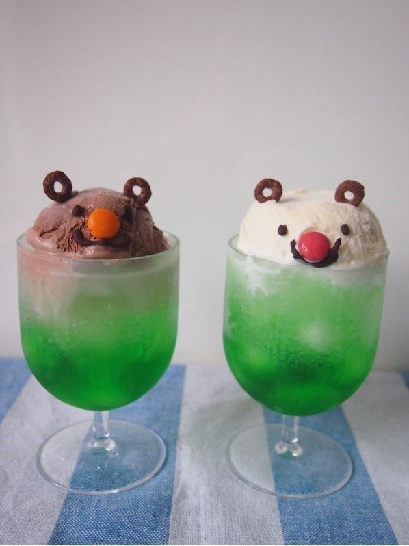 喫茶店によくあるクリームソーダー。かき氷のシロップ、炭酸水、アイスでおうちでも簡単に作れます。くまちゃんにデコするともう子供の心はわしづかみ!