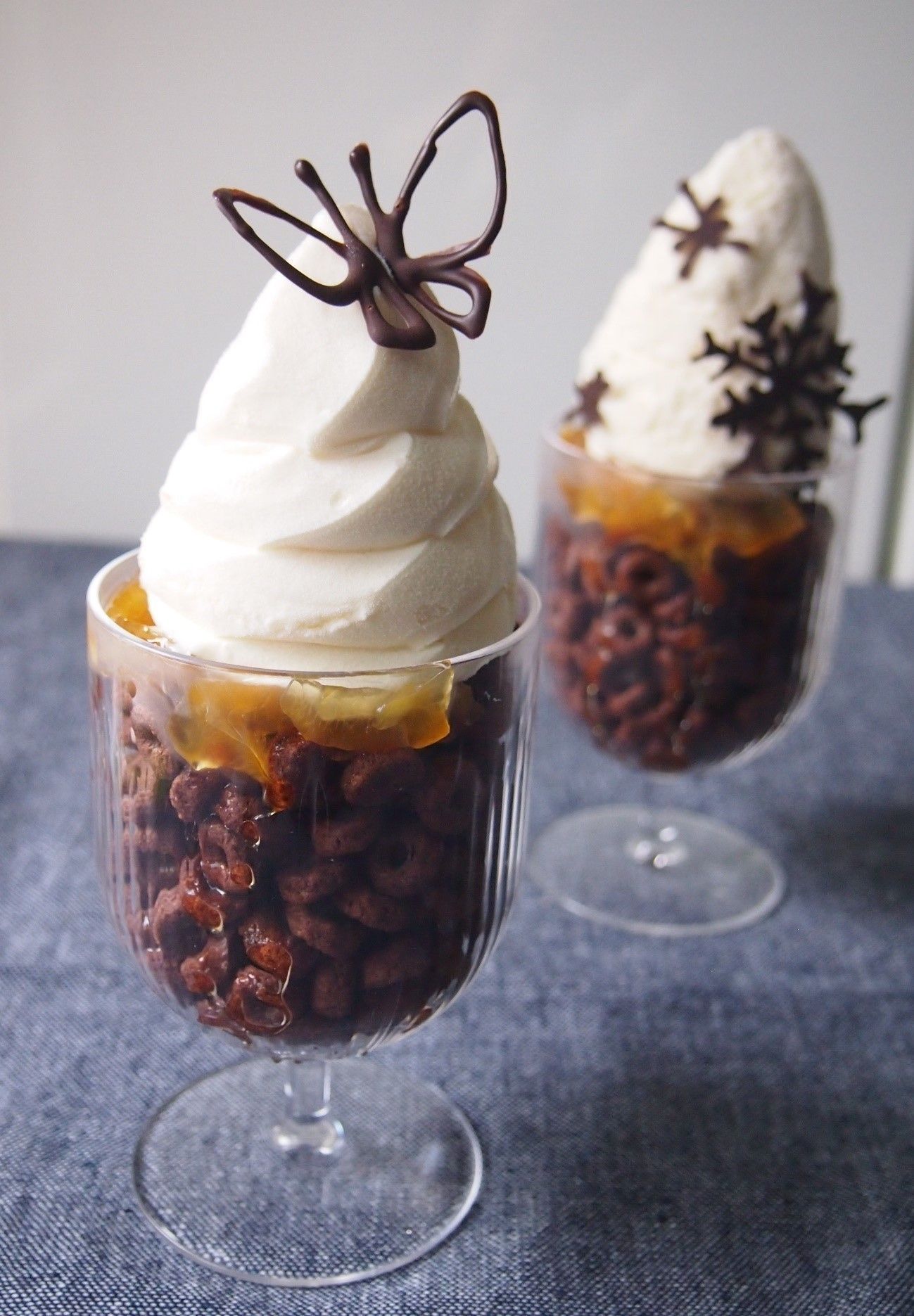 グラスにシリアル、マーマレードジャム、市販のソフトクリームの上をドーンとのせたら、迫力満点なフォトジェニックパフェが完成。チョコペンがあれば、可愛くデコするとよりキュートに。