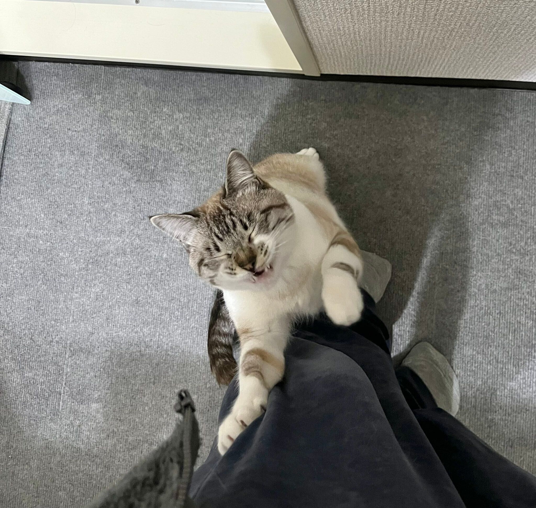 眠くてもやくまろさんのもとへ頑張ってついてきたちくわくん。寝ぼけながらの爪とぎには、思わずやくまろさんの脚を使用してしまいましたが、それもきっと甘えたい気持ちの表れだったのではないでしょうか。