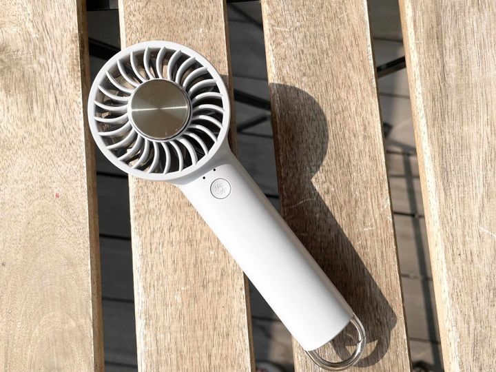 カラビナ部分を90度にすれば、本体が自立するのもうれしいポイント。握るタイプのハンディファンですが、テーブルなどに置いて使用する事も可能です。