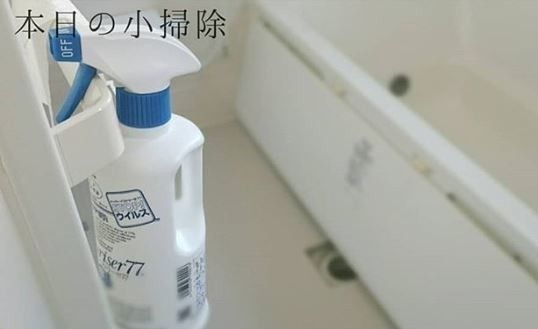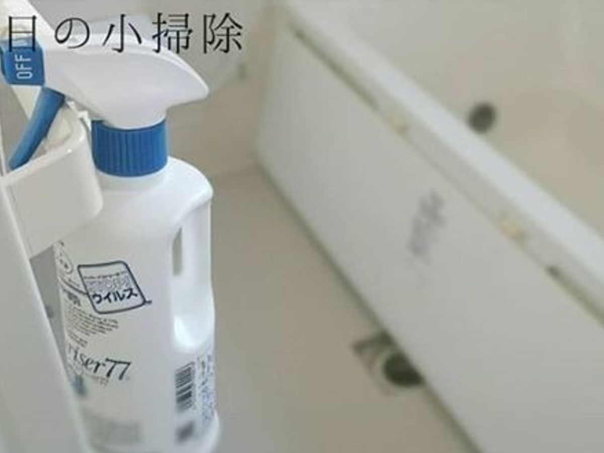 なかなか掃除しにくい浴室の天井は、パストリーゼをスプレーして、キッチンペーパーで拭き上げ。カビなどで汚れてしまう前に、こうしていれば汚れ防止になりそうです。