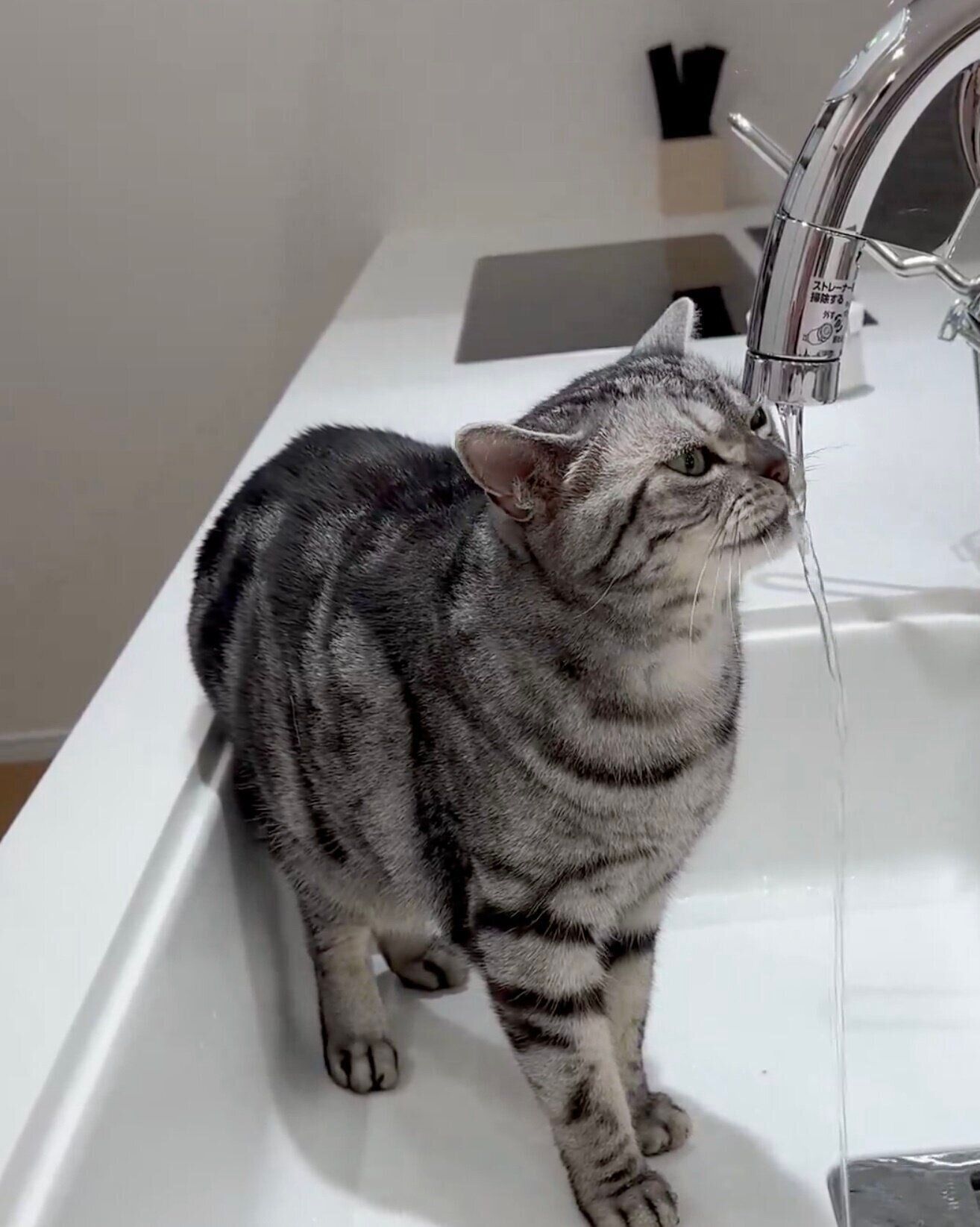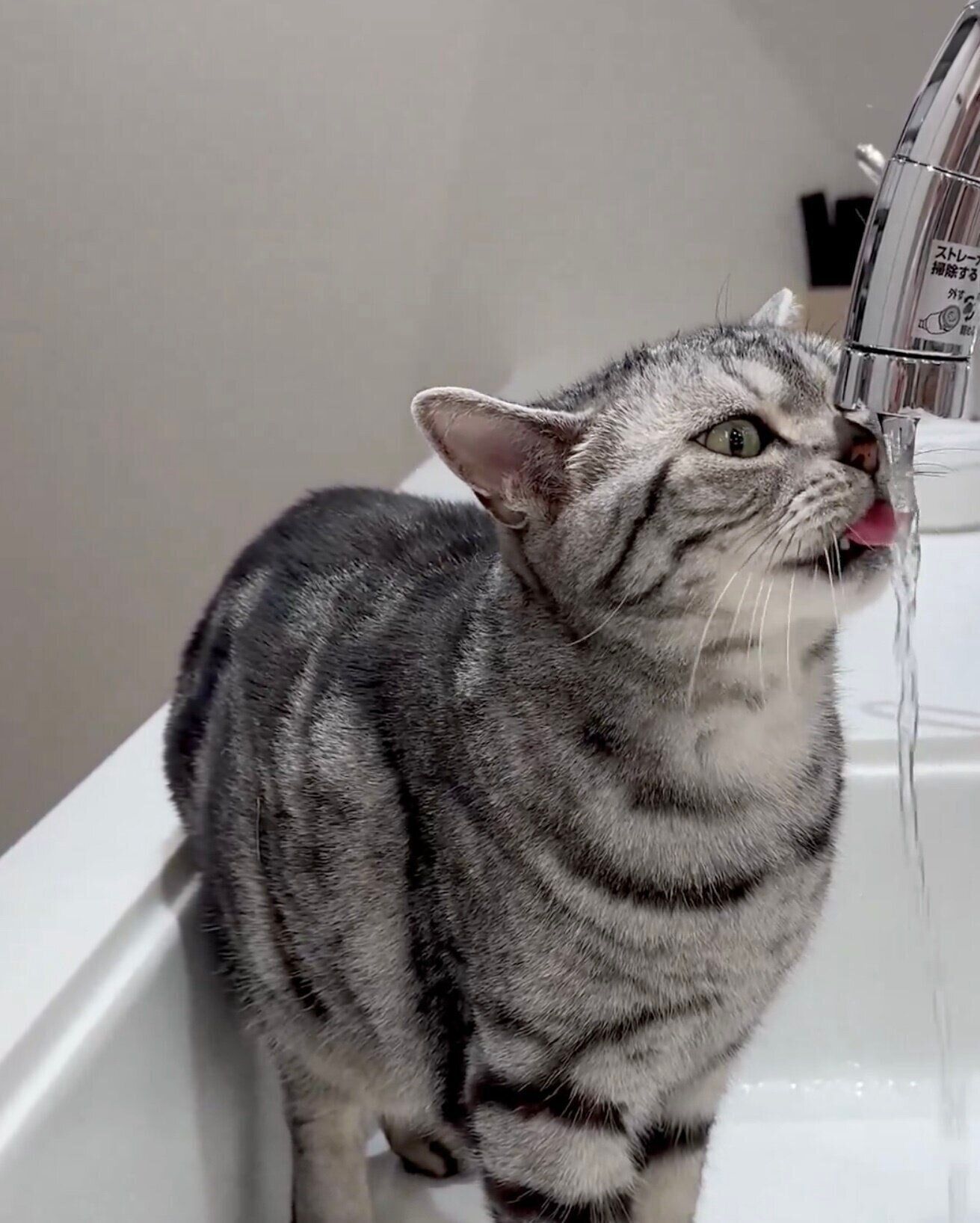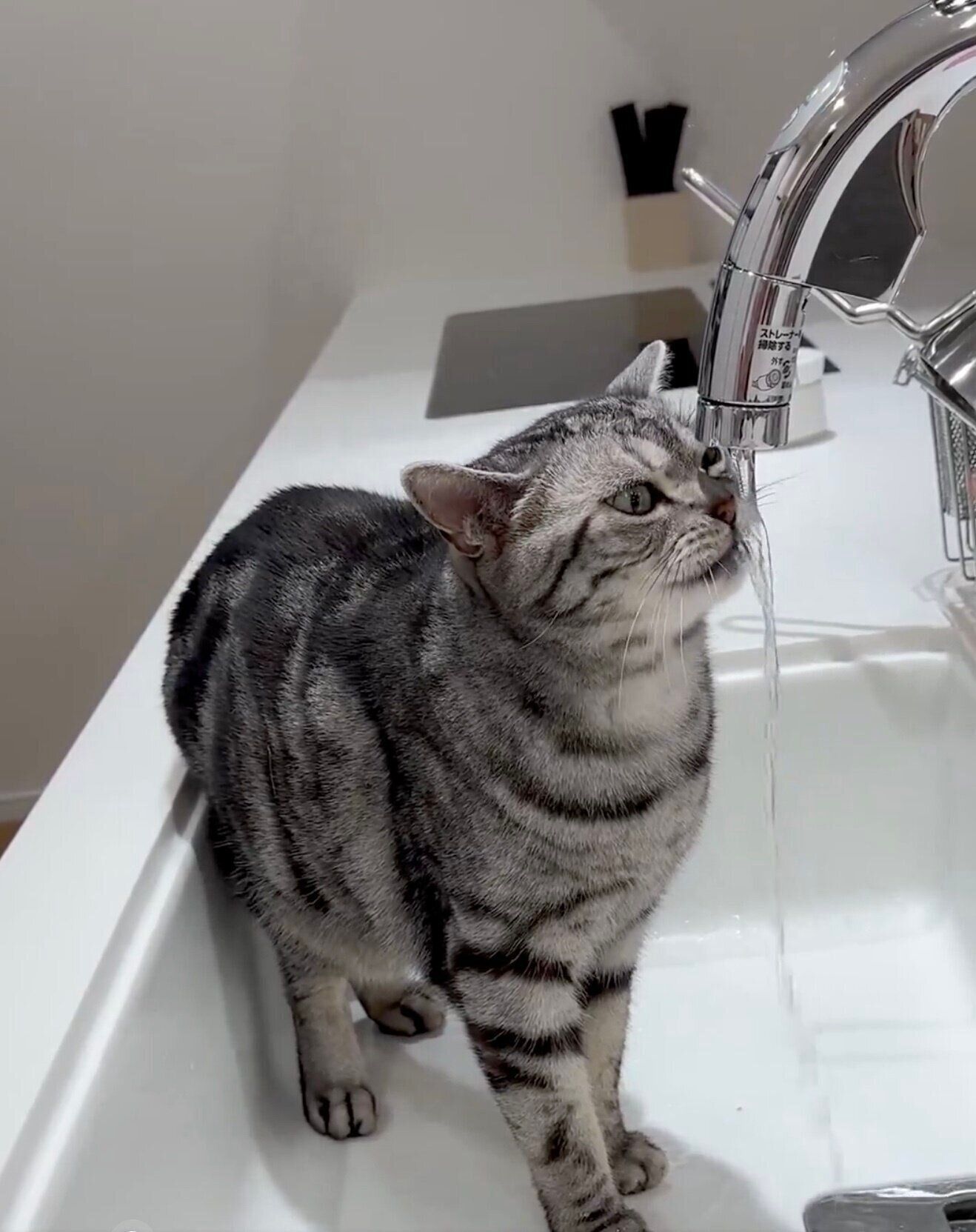 投稿したのは、アメリカンショートヘアの佐助くんが水を飲んでいるときの動画。