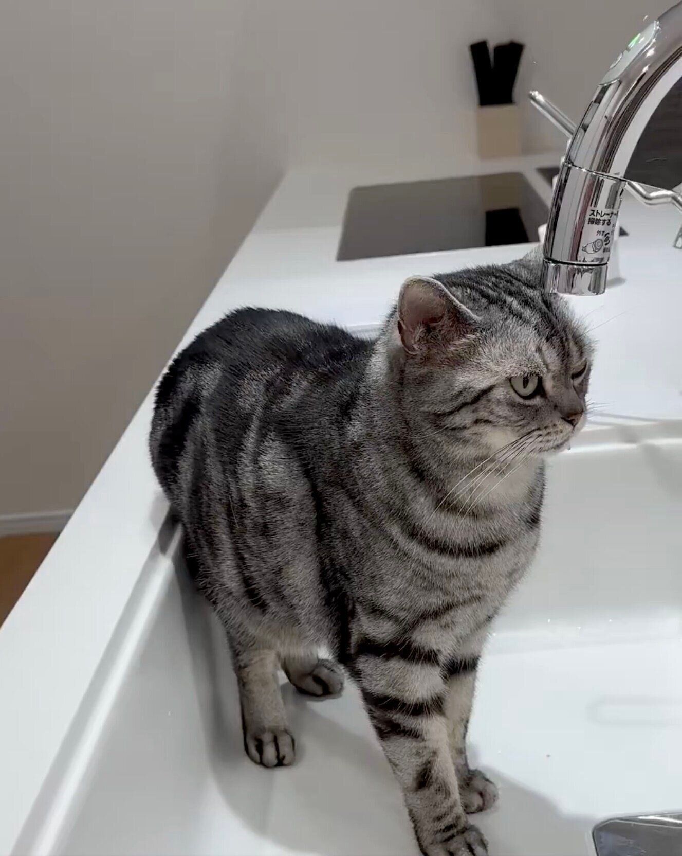 「家を新築した7年前に、15分でセンサーがオフになる水栓を取り付けました。佐助は元々チョロチョロ出るお水を飲むのが好きなので、センサー付き水栓にしておけば止めなくていいから楽だと思い、水流を絞って出してあげたらすぐ覚えました。ただ、シンクに入って飲むのは誤算でした(笑)」