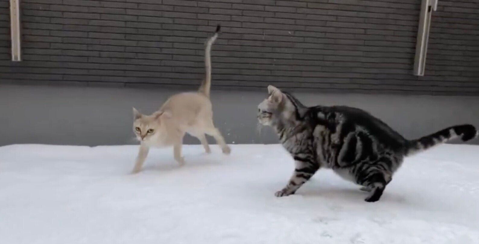 他の猫ちゃんが足をプルプルと振って足についた雪を振り落とすなか、佐助くんはまったく動じず。