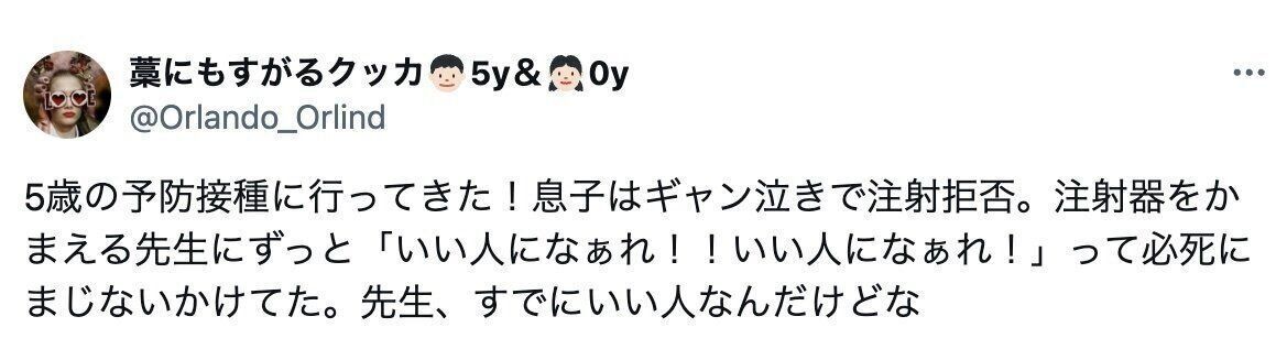 ママがこの投稿をすると、Xでは2万件のいいねと「注射器持っているだけで先生が悪い人扱いなの笑ってしまいましたwww」「息子くん、いい人になぁれってかわいすぎます笑笑」「いい人だから、泣かれても予防接種してくれるんですよね」といったコメントが寄せられ、話題になりました。