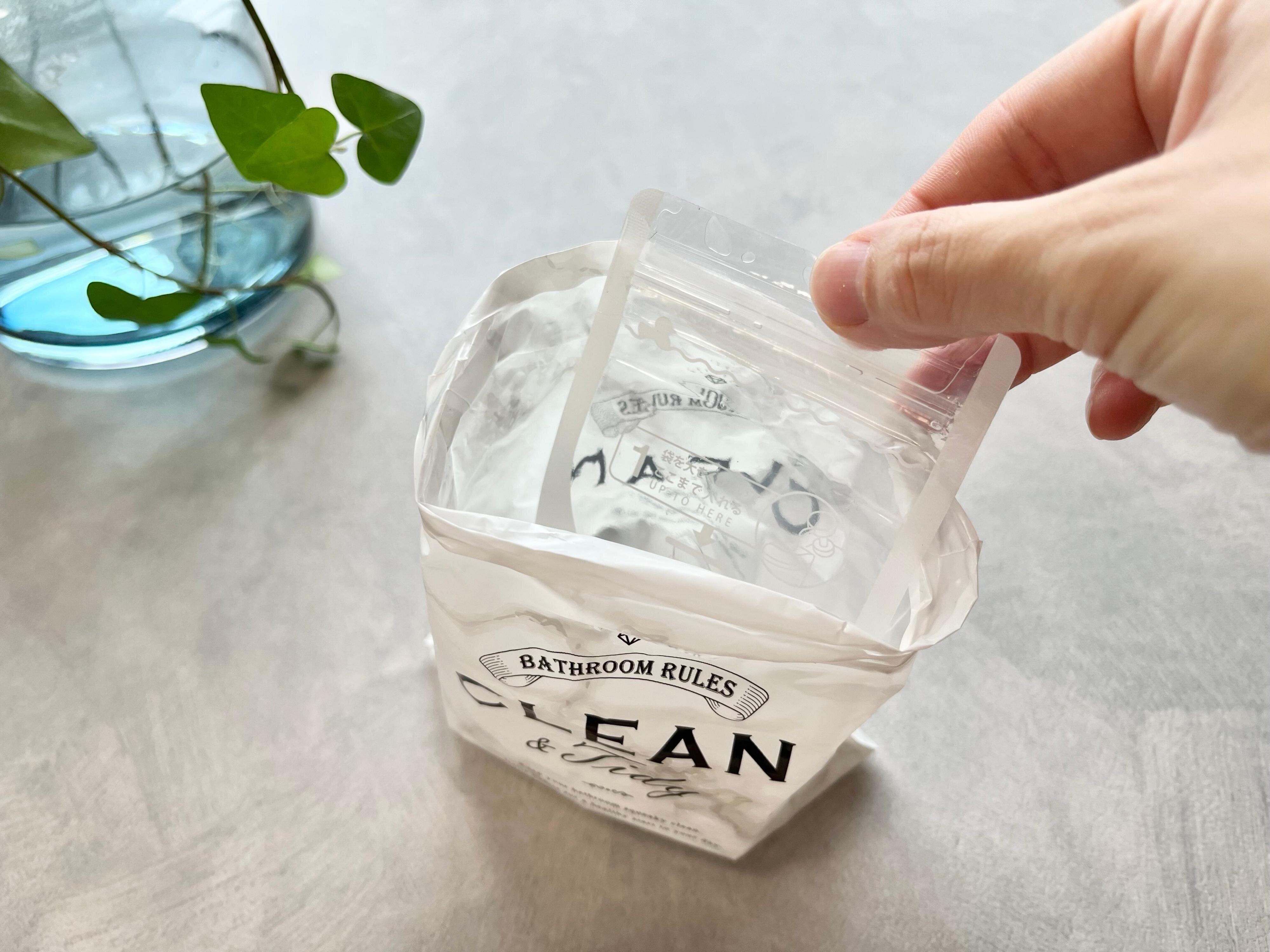 こちらの商品は透明のパウチが8枚と、少し大きめのチャック付きの袋が1枚入って、110円で販売されています。