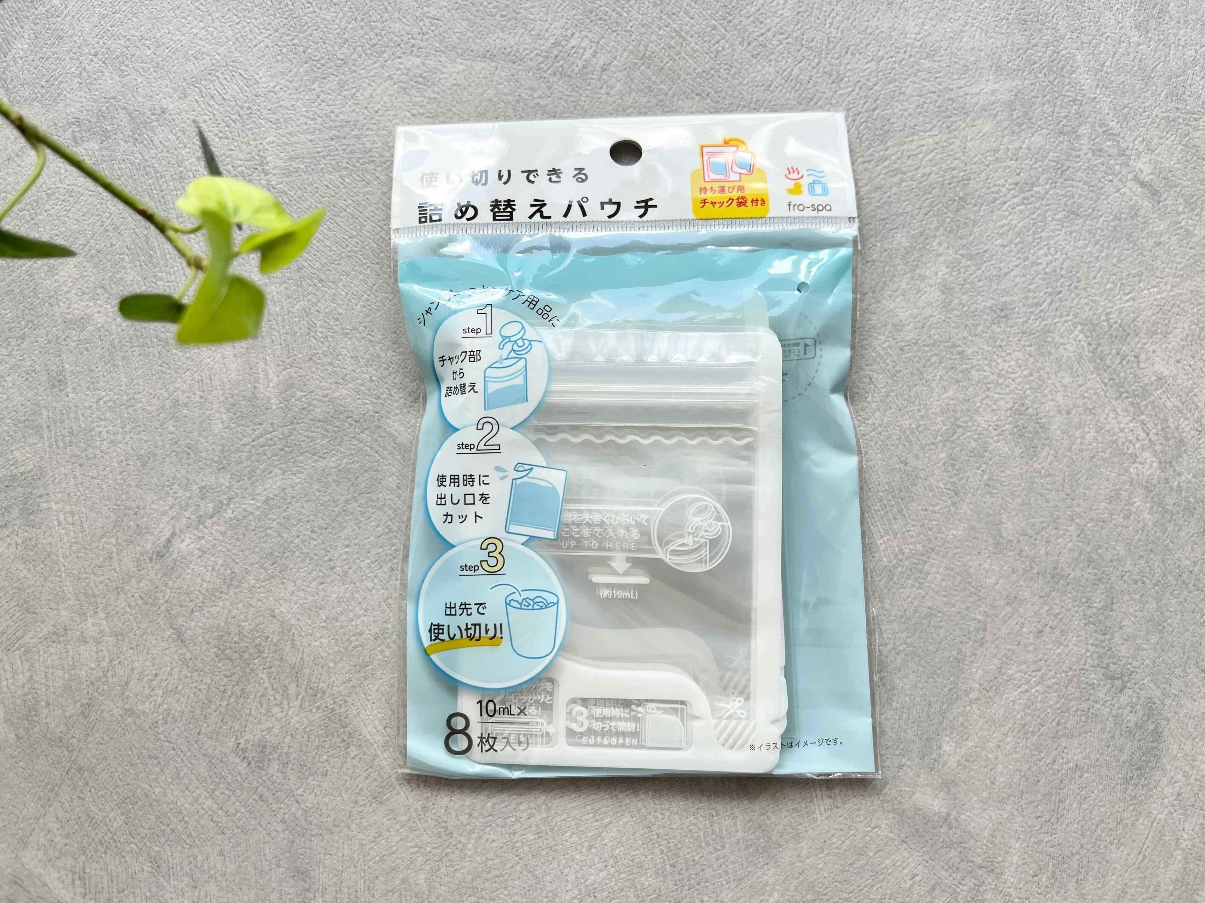それにパウチが8枚も入っているので、長期の旅行でなければ1セット買えば、普段から使っているお気に入りのヘアケアやスキンケア用品を全部詰め替えることができるかと思います。