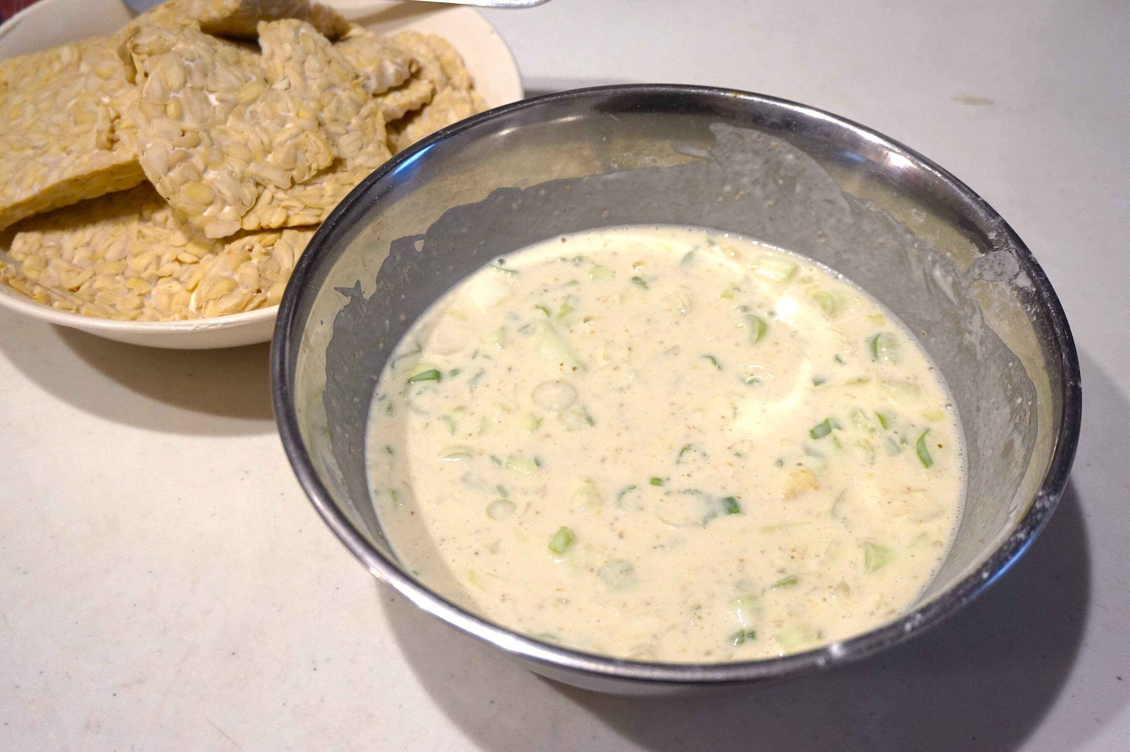 「テンペ」と揚げ油以外の材料を混ぜて衣を作ったら、「テンペ」をくぐらせて揚げていきます。衣に小麦粉と米粉を使っていますが、米粉をなしにして小麦粉150gでも作れます。また、てんぷら粉などで作っても問題ありません。
