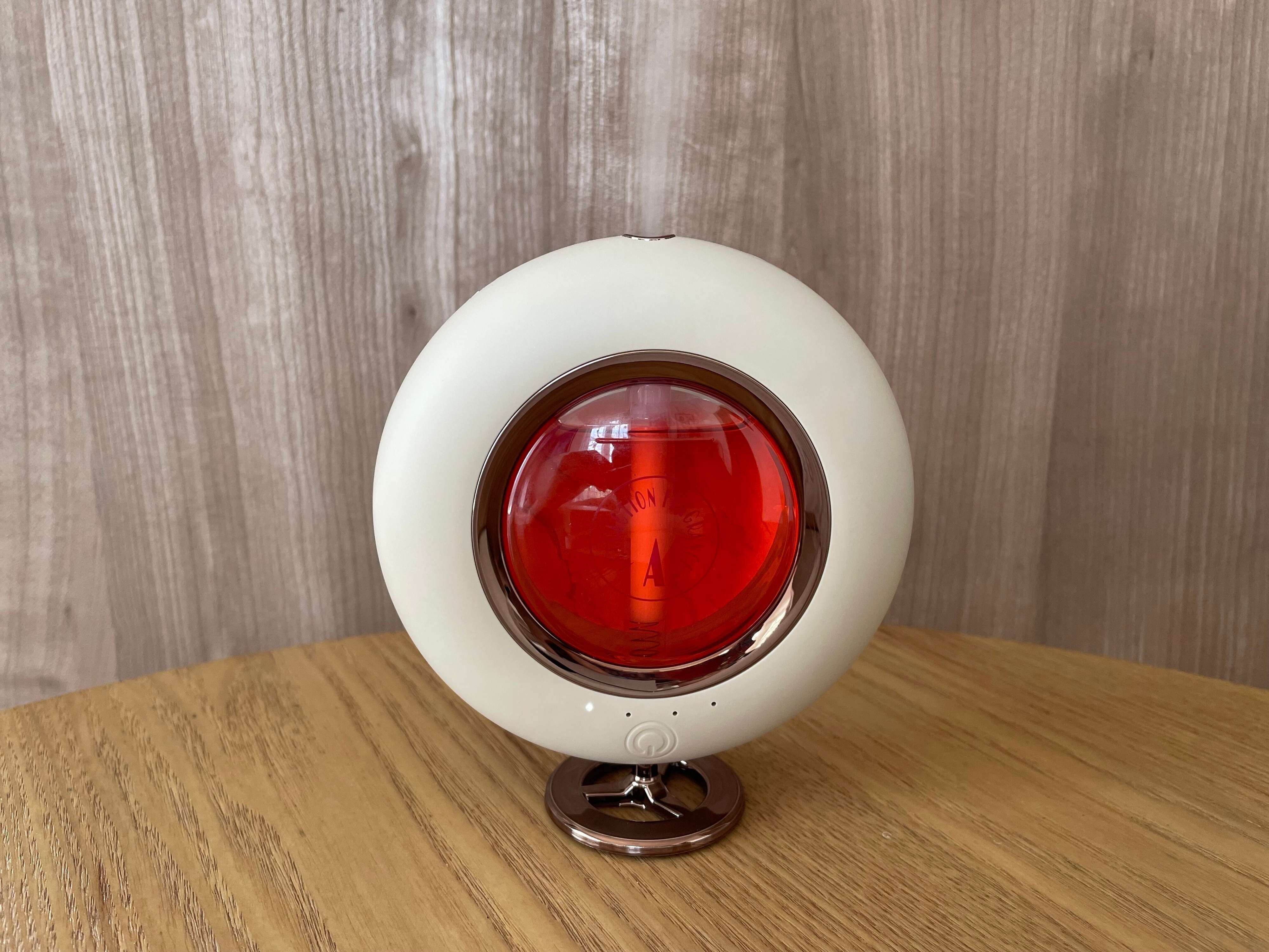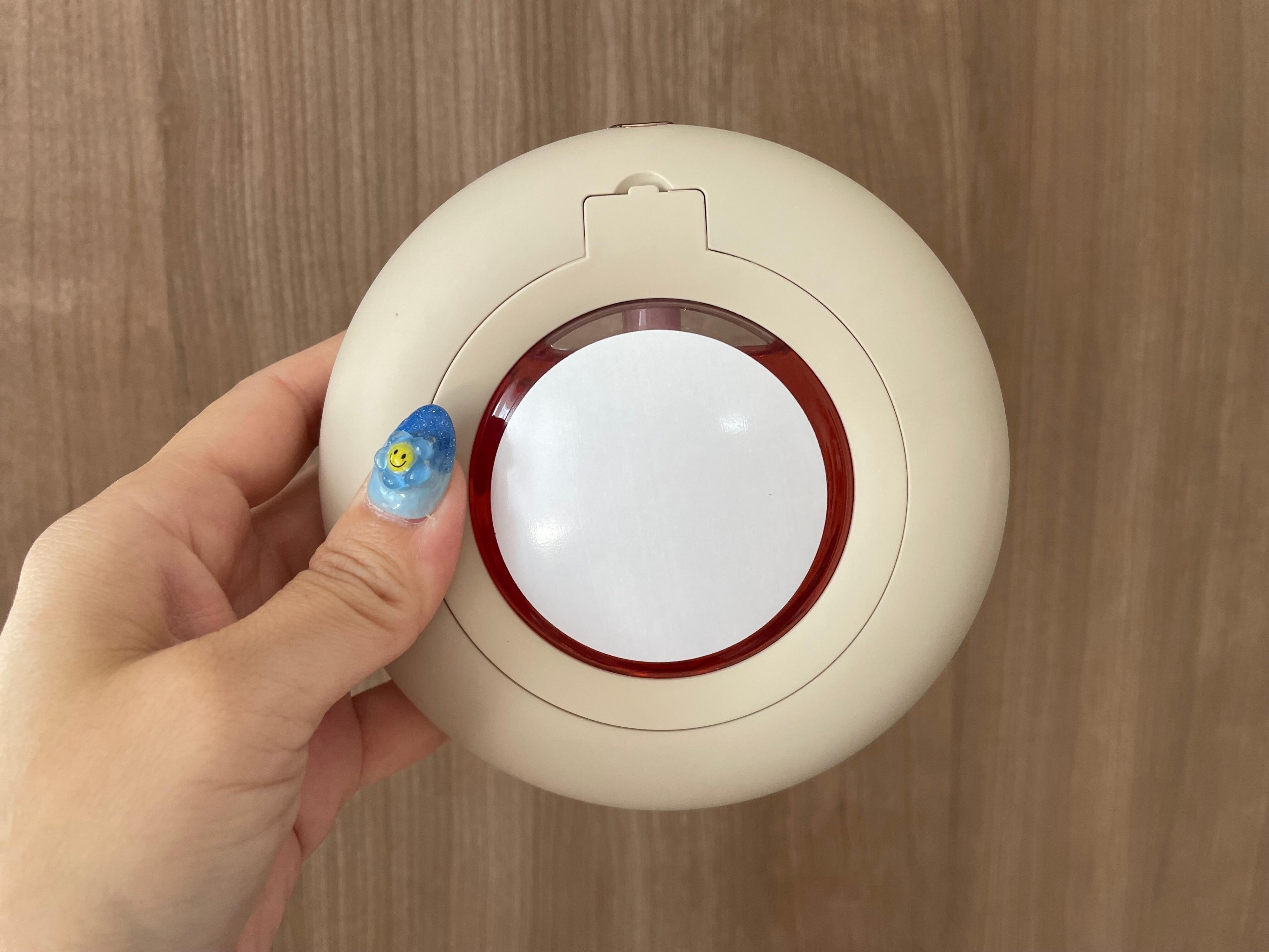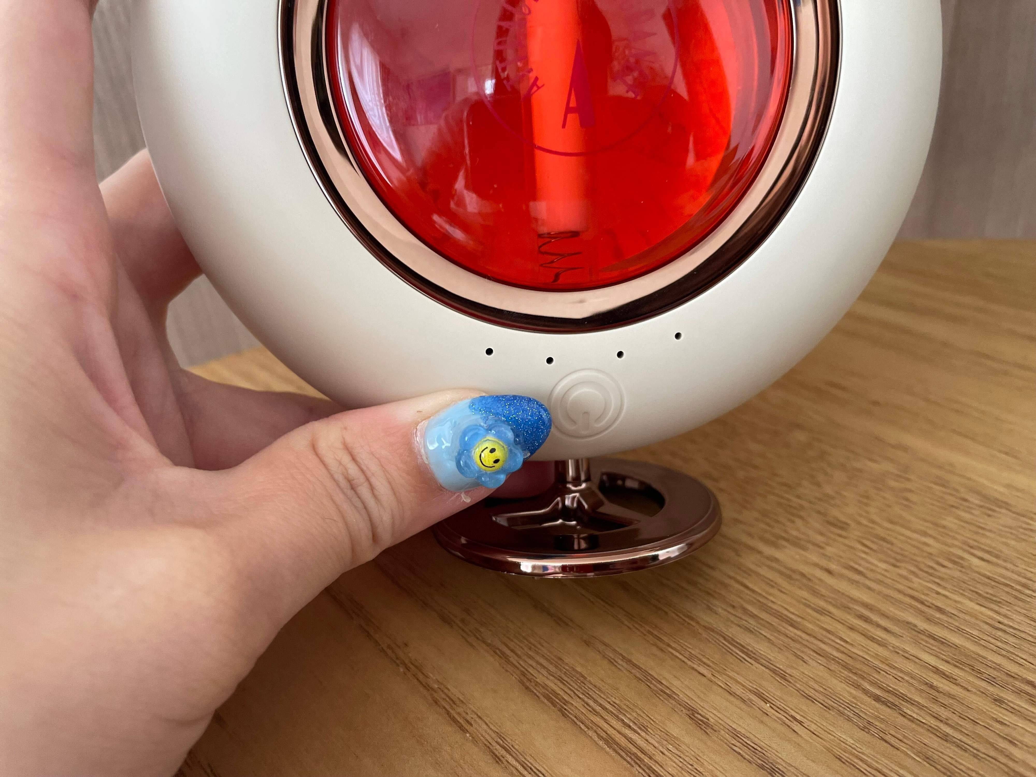 電源ボタンを3秒長押しすると「ピー」という音とともに電源がONになり、ライトが点滅します。ONの状態で電源ボタンを押すと香りのレベルを調節できます。OFFにしたいときは、電源ボタンを3秒長押しして「ピー」という音が出ればOK。