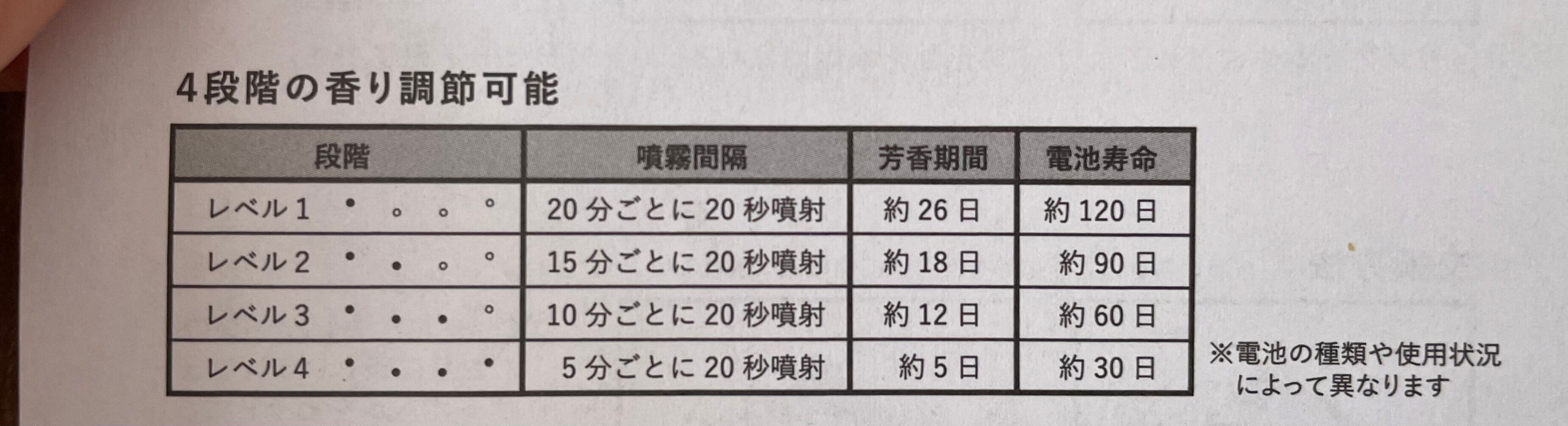 「電動ディフューザー/ATTRACTION FRAGRANCE」は、レベル1~レベル4まで4段階の香り調節が可能。筆者はレベル1の設定で玄関に置いていますが、割としっかり香りが香っている状態をキープできているので、よほど広い部屋でない限りレベル1~2で十分な印象です。