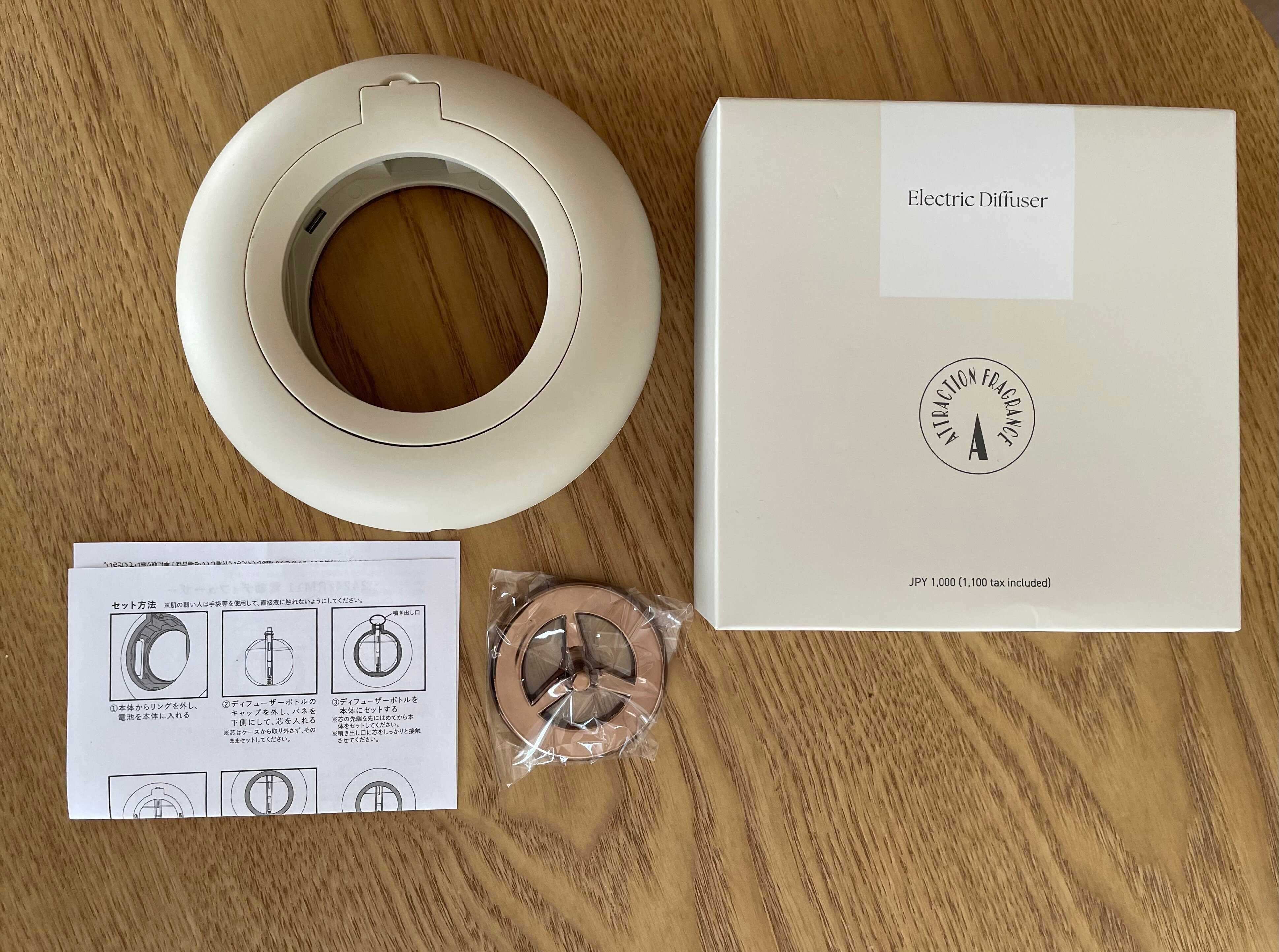 セット内容は、本体、土台、取り扱い説明書。本体のリングを外して、中に電池やディフューザーをセットする仕組みになっています。