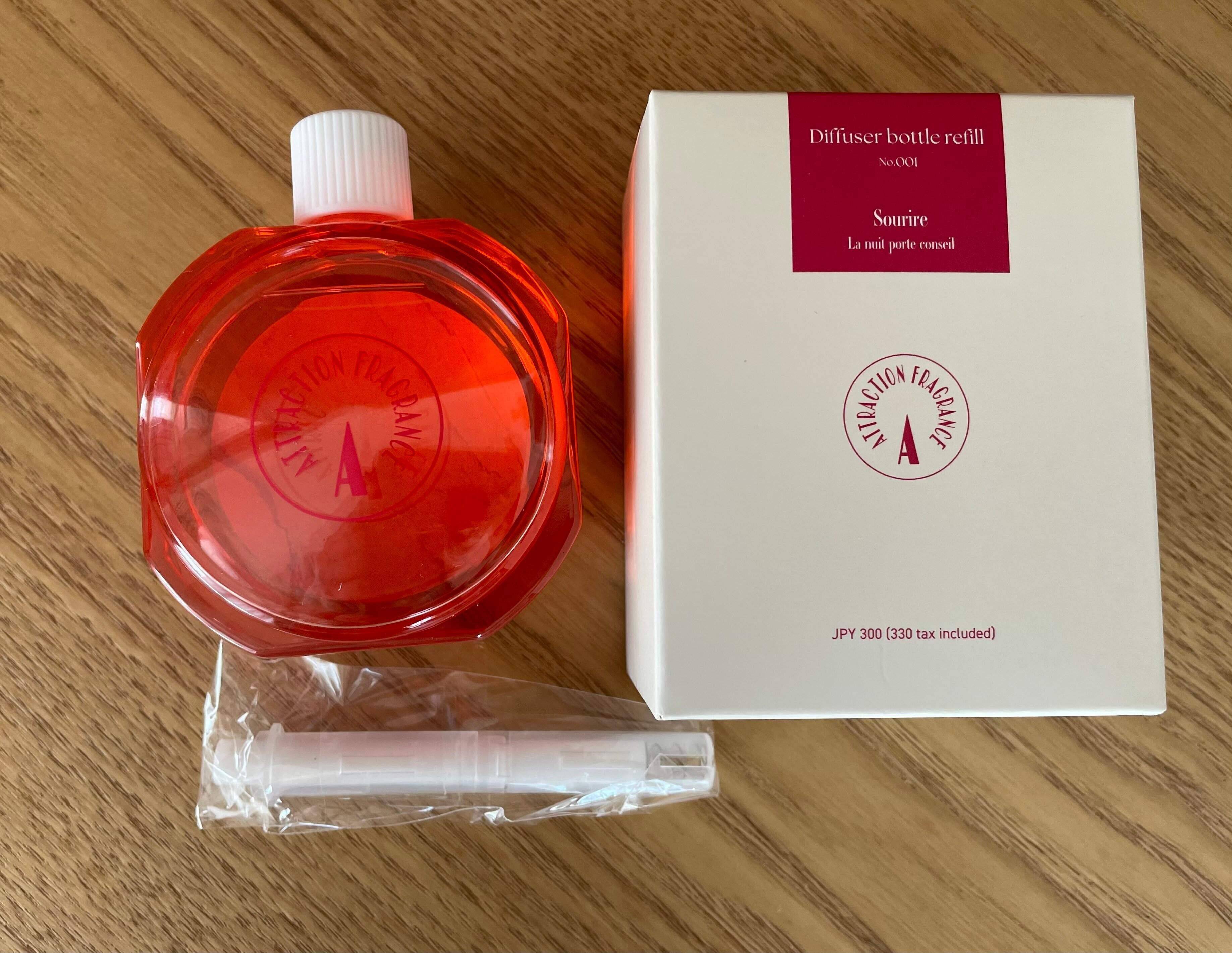 本体の準備ができたら「交換用ディフューザー/ATTRACTION FRAGRANCE」(330円)を用意します。別売りなので要注意!香りの種類は6種類あるので、好みの香りを選びましょう♪ 筆者は「Sourire」という、紅茶の柔らかな甘い風味とはちみつがかったローズの花びらのとろけるようなまろやかな香りをチョイス。