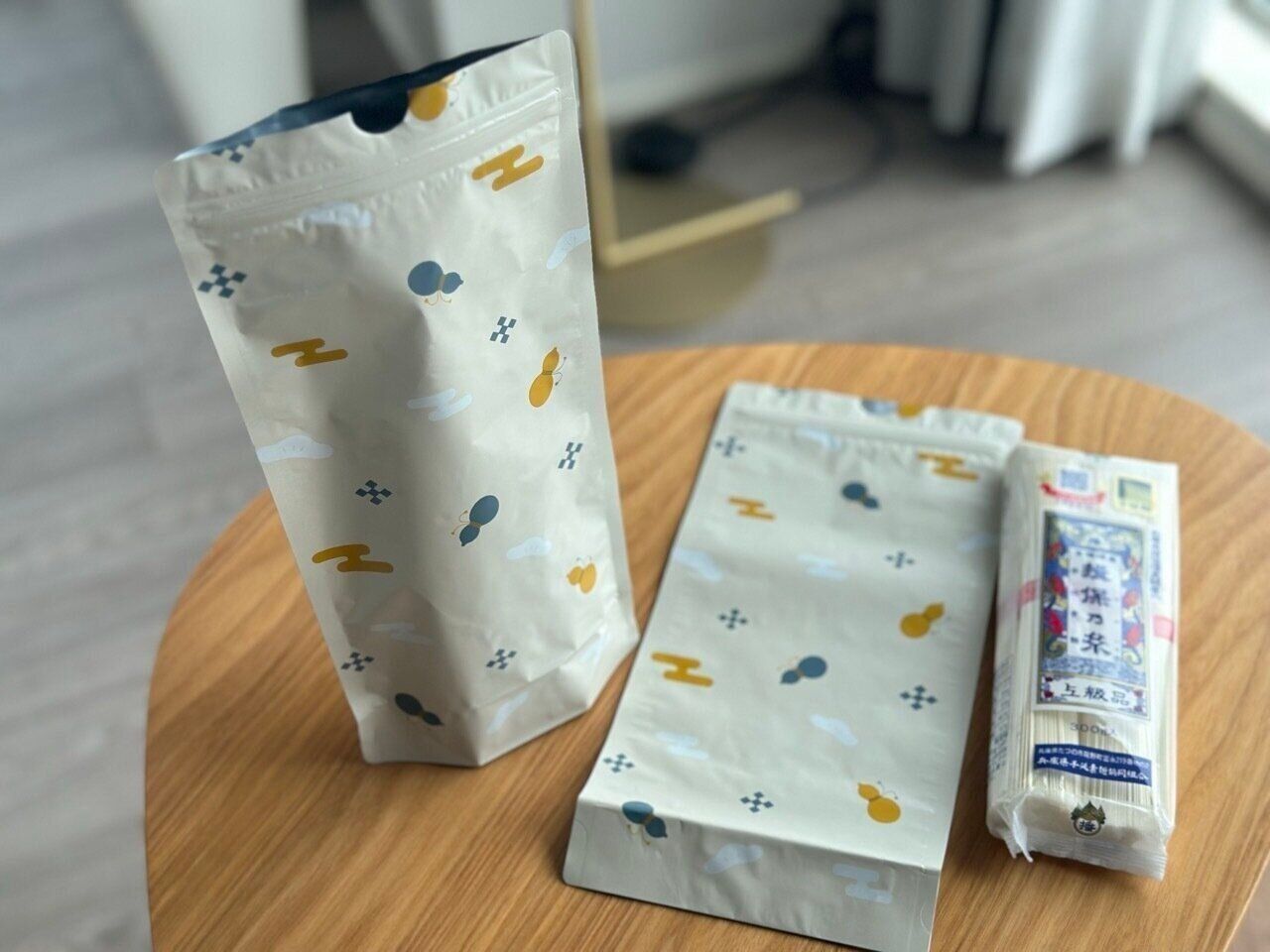 開封済みのそうめんが袋ごとすっぽり入るので、原材料や賞味期限を確認しやすく、自立してくれるので立てて収納しておくことも可能です。